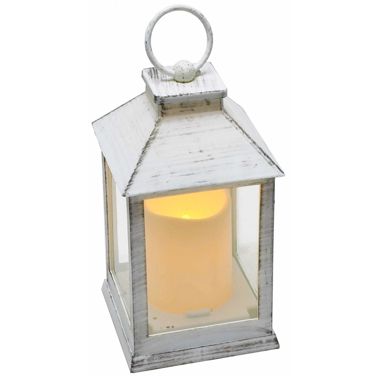 Lanterna bianca antichizzata completa di candela bianca a luce tremolante. Questo complemento d'arredo illuminato dona calore all'atmosfera ed è adatto ad essere posizionato in qualsiasi ambiente in quanto funzionante a batterie (non incluse 3xAAA).