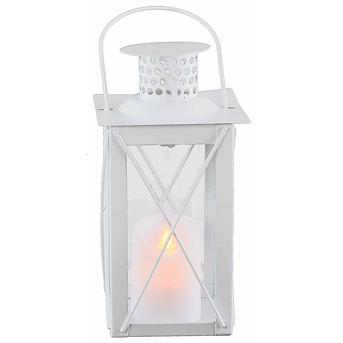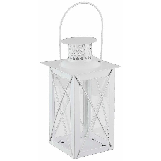 Lanterna bianca in metallo con coperchio sormontato da un cilindro traforato e pareti di vetro, la parte superiore si apre permettendo di posizionare all'interno lumini o candele. Sul nostro sito sono disponibili varie tipologie di articoli per illuminarla.