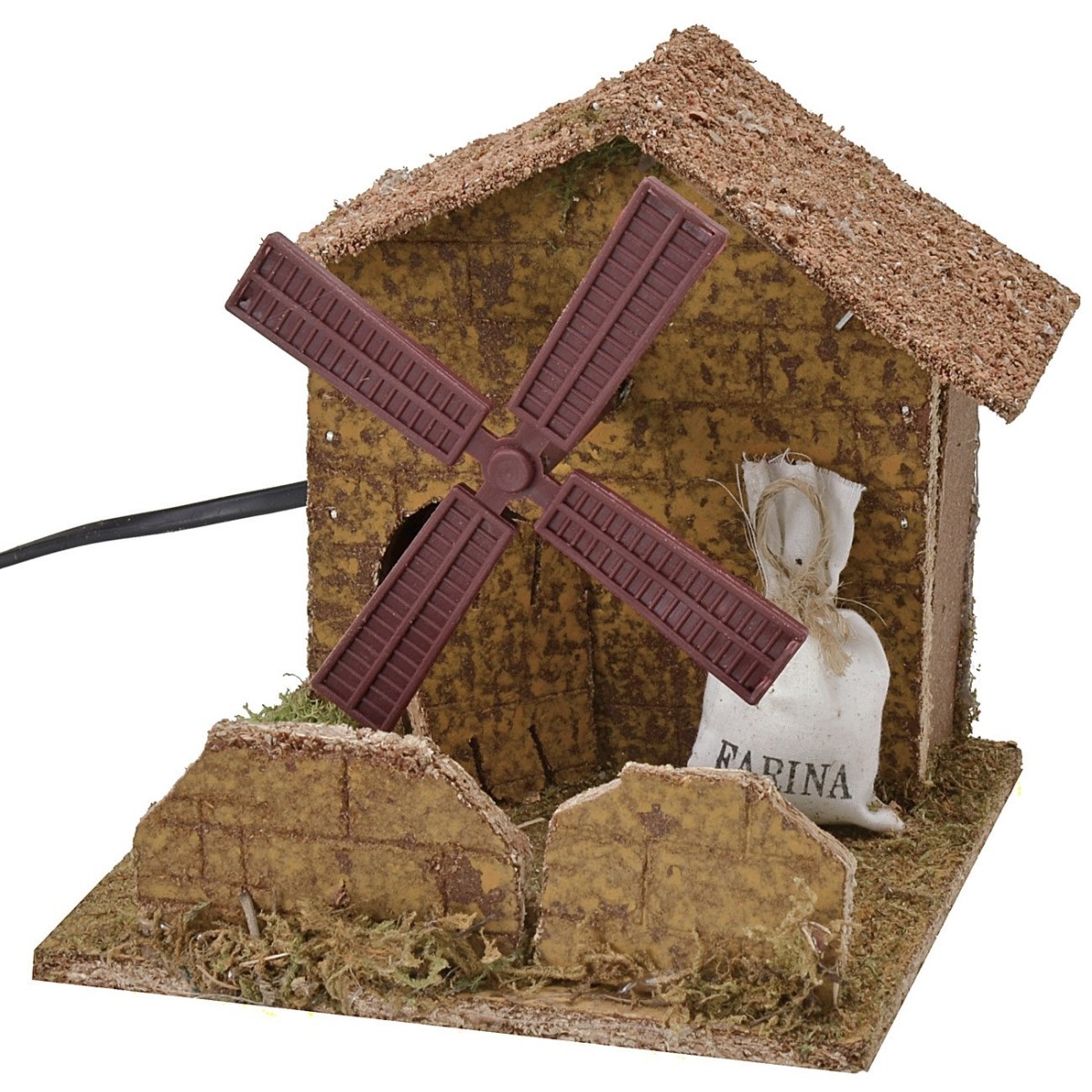 Mulino a vento funzionante a corrente. In primo piano un rudere di muretto dietro il quale si erge la struttura con tetto spiovente che sostiene le quattro grandi pale che girano, a fianco un sacco bianco di farina. L'articolo è consigliato per statue di altezza 6-8 cm.