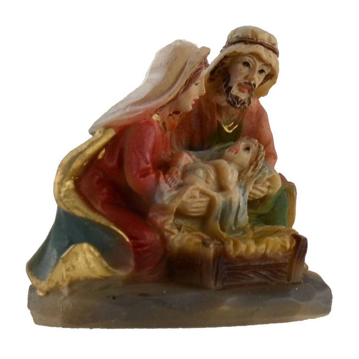 Natività monoblocco in resina, con Gesù Bambino tra le braccia della Madonna e di San Giuseppe.
