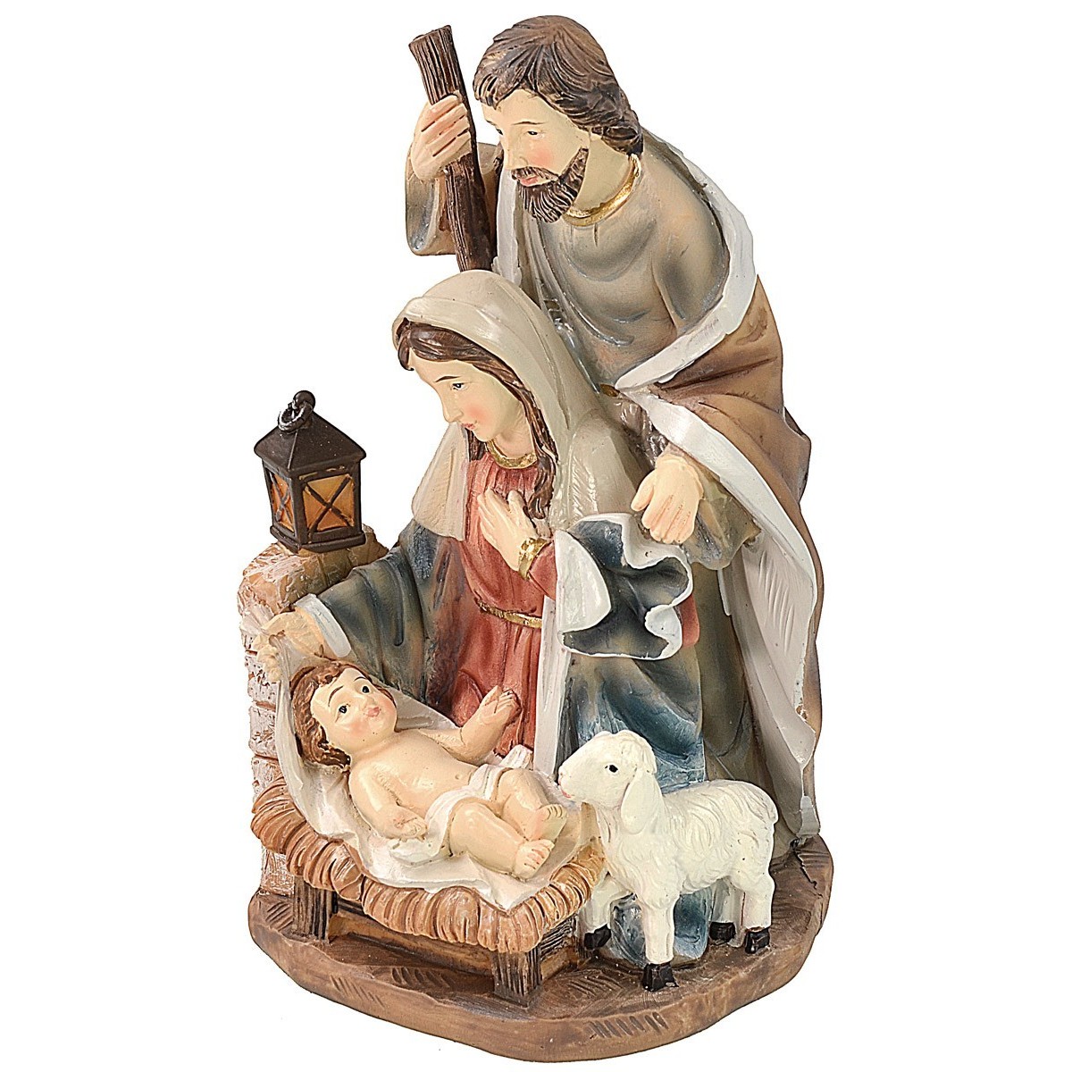 Natività in blocco unico, dalle dimensioni cm 8,5x8x15 h, comprendente: San Giuseppe, Maria, Gesù bambino e una pecorella in serie da 15 cm. In particolare, San Giuseppe è alto 14 cm, Maria, inginocchiata, misura 10 cm, la culla del Gesù bambino ha dimensione 5,5x3,5 cm, mentre la pecorella è 4 cm di altezza. Prodotto realizzato interamente in Italia da sapienti mani artigiane, utilizzando la resina.