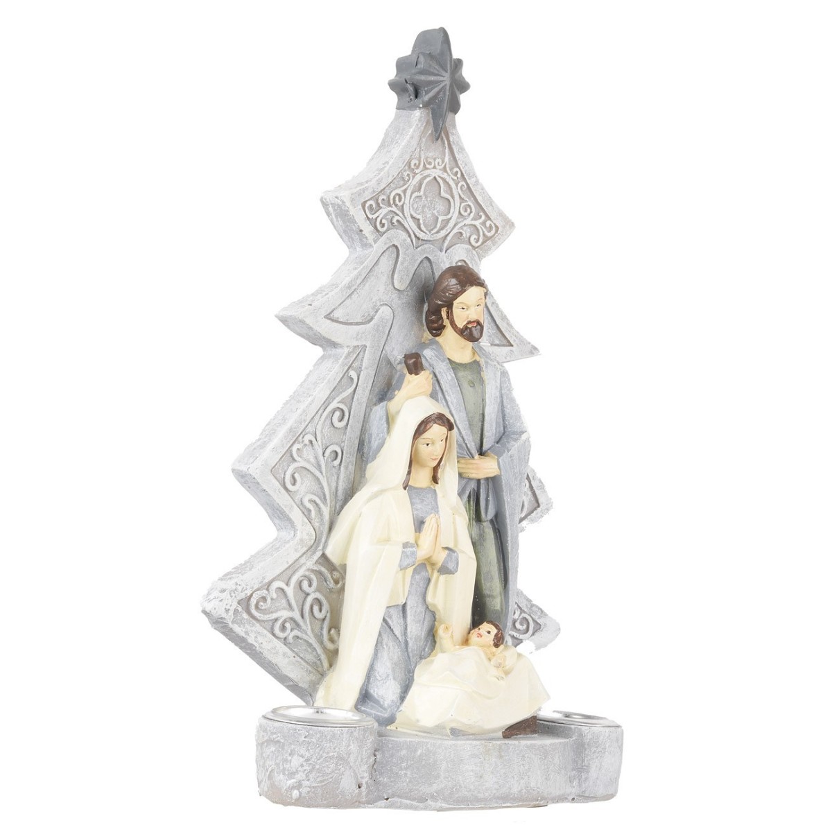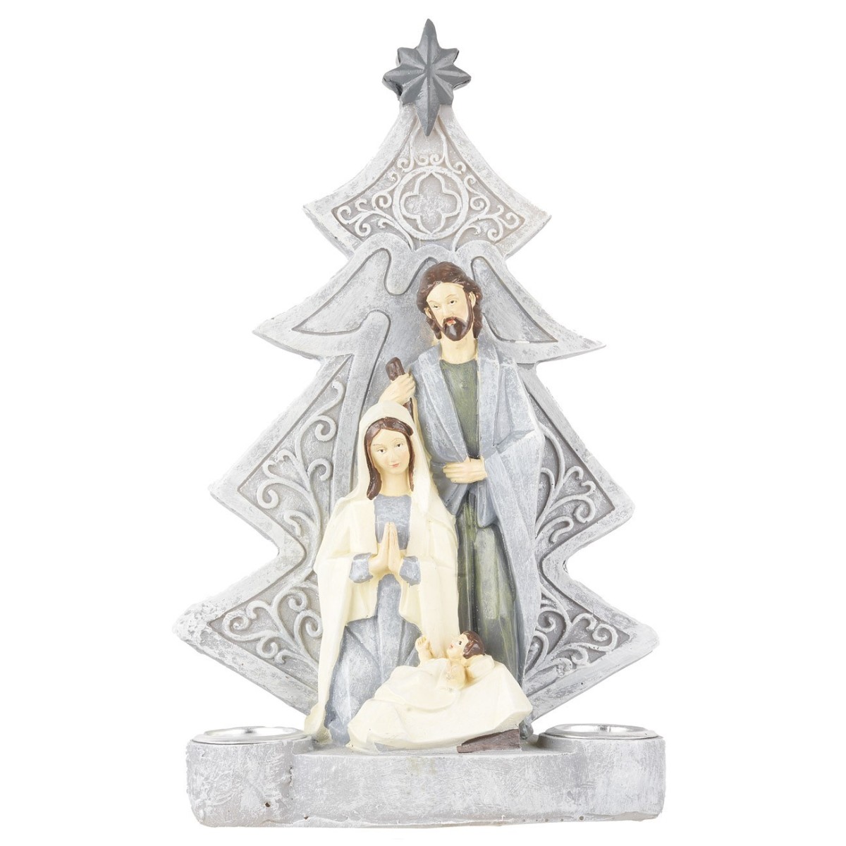 Albero porta candele con Sacra famiglia in resina composta da San Giuseppe e Maria inginocchiata e Gesù Bambino nella culla.