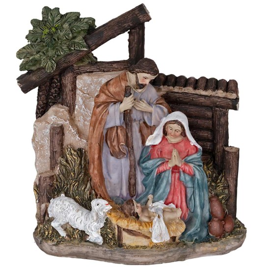 Natività  in resina con San Giuseppe, Maria inginocchiata, Gesù Bambino in culla e pecorella.