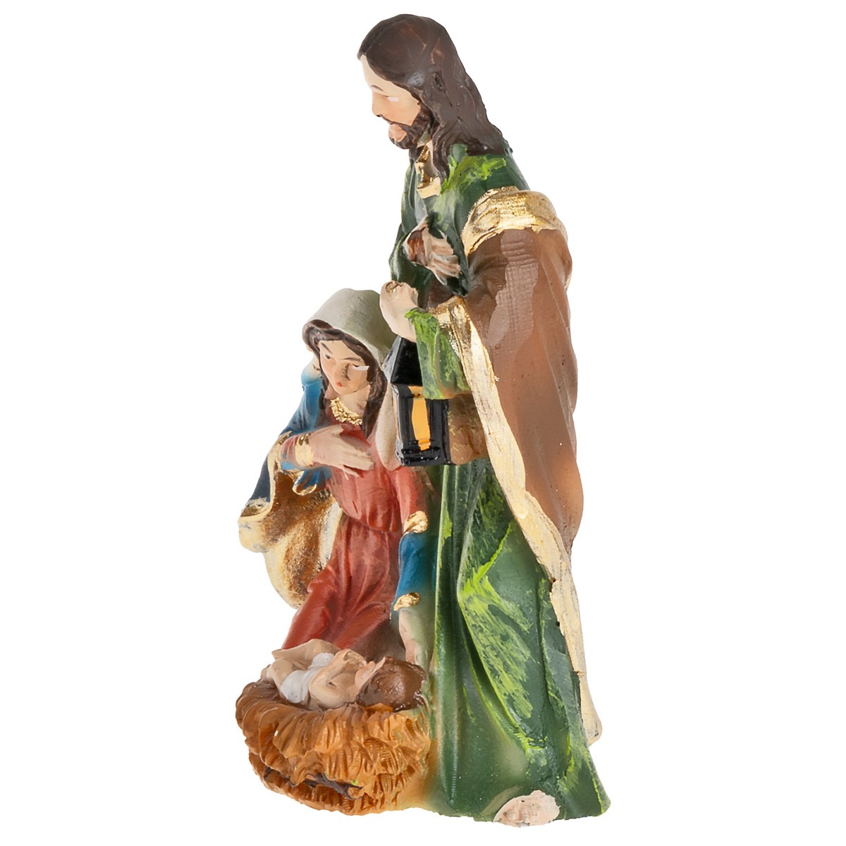 Sacra Famiglia in resina dipinta serie 13 cm composta da Maria, Giuseppe e Gesù Bambino.