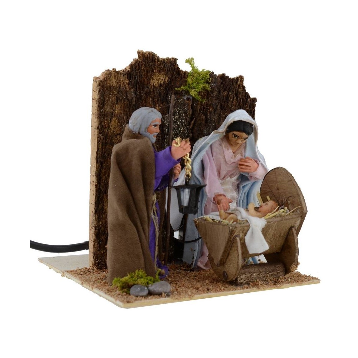 Natività in movimento cm 10. Giuseppe muove il braccio con cui sostiene la lampada e Maria chinandosi verso il Bambinello muove la culla di legno. Statue realizzate in terracotta dipinte a mano in Italia da sapienti mani artigiane, ben rifinite con vestiti in tessuto. Statue adatte al Presepe classico popolare.