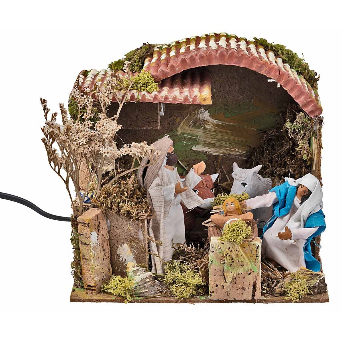 Capanna illuminata con Natività in movimento funzionante a corrente. Maria culla Gesù Bambino muovendo il braccio, mentre Giuseppe si avvicina al figlio con un movimento del busto. Nella capanna sono presenti anche l'asino e il bue un terracotta. Le statuine sono realizzate in terracotta e dipinte a mano in Italia vestite con abiti in tessuto. Si precisa che i colori dei del prodotto possono variare in quanto realizzato artigianalmente.