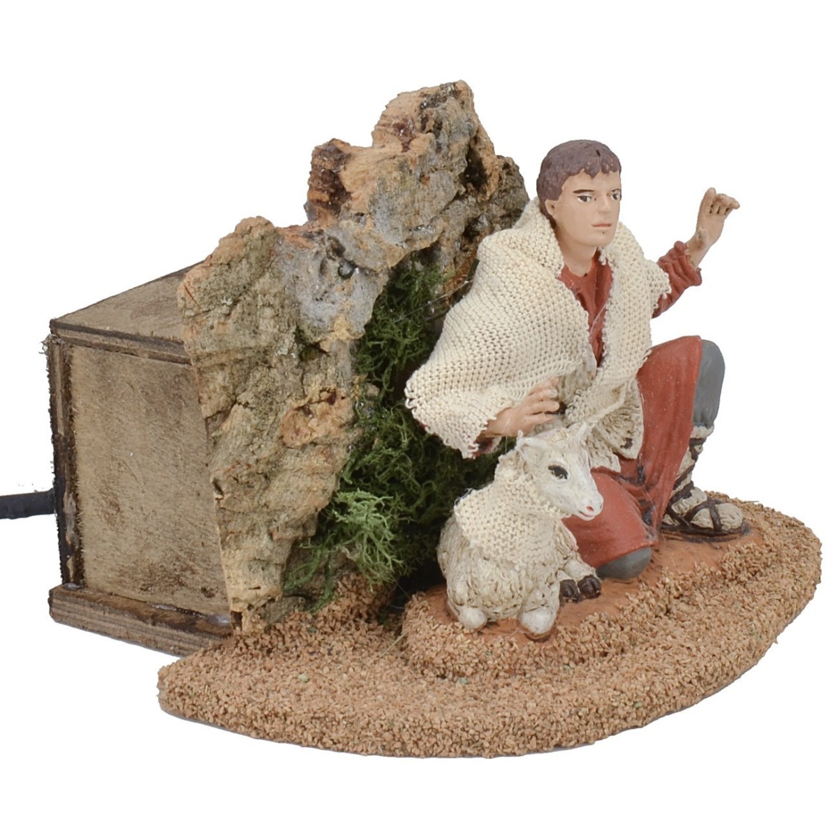 Pastore inginocchiato che con la mano destra accarezza la pecora che china il capo, serie 15 cm doppio movimento. La scena è arricchita con sughero a formare una parete di roccia. La statua presenta un viso espressivo, ogni pezzo è realizzato interamente a mano da artigiani italiani pertanto i colori e gli abiti potrebbero variare. L'articolo è funzionante a corrente.