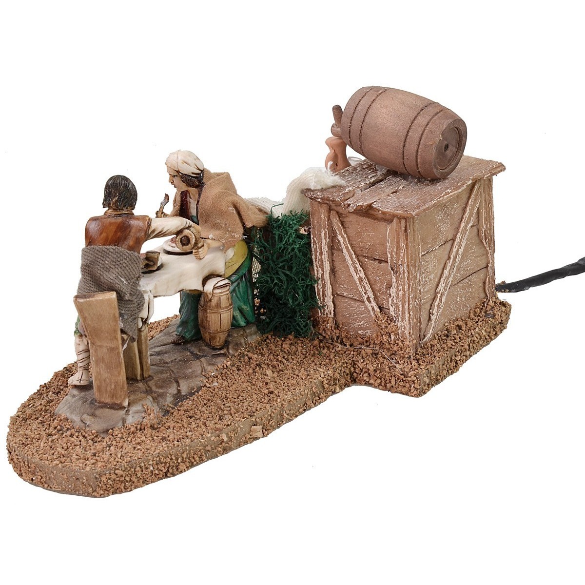 Scena con doppio movimento di un uomo e una donna serie 10 cm Landi Moranduzzo che mangiano; la donna porge all'uomo il bicchiere di vino mentre l'uomo i appresta a versargliene dell'altro. Statua per Presepe realizzata in Italia, ben rifinita nei dettagli con mantello in tessuto e volto molto espressivo. La scena è arricchita con un tavolo e una botte di vino. L'articolo è funzionante a corrente.