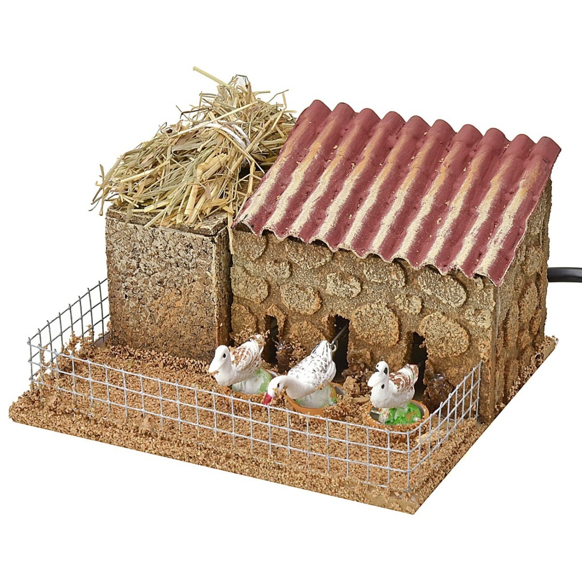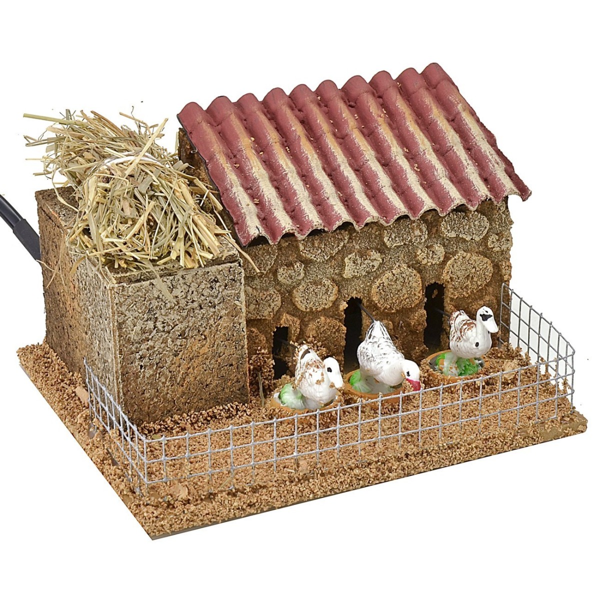Papere da cortile in movimento che beccano. Scena per Presepe realizzata artigianalmente in Italia, ben rifinita nei dettagli e arricchita da un recinto in metallo che delimita lo spazio antistante al rifugio dei volatili. L’articolo è funzionante a corrente.