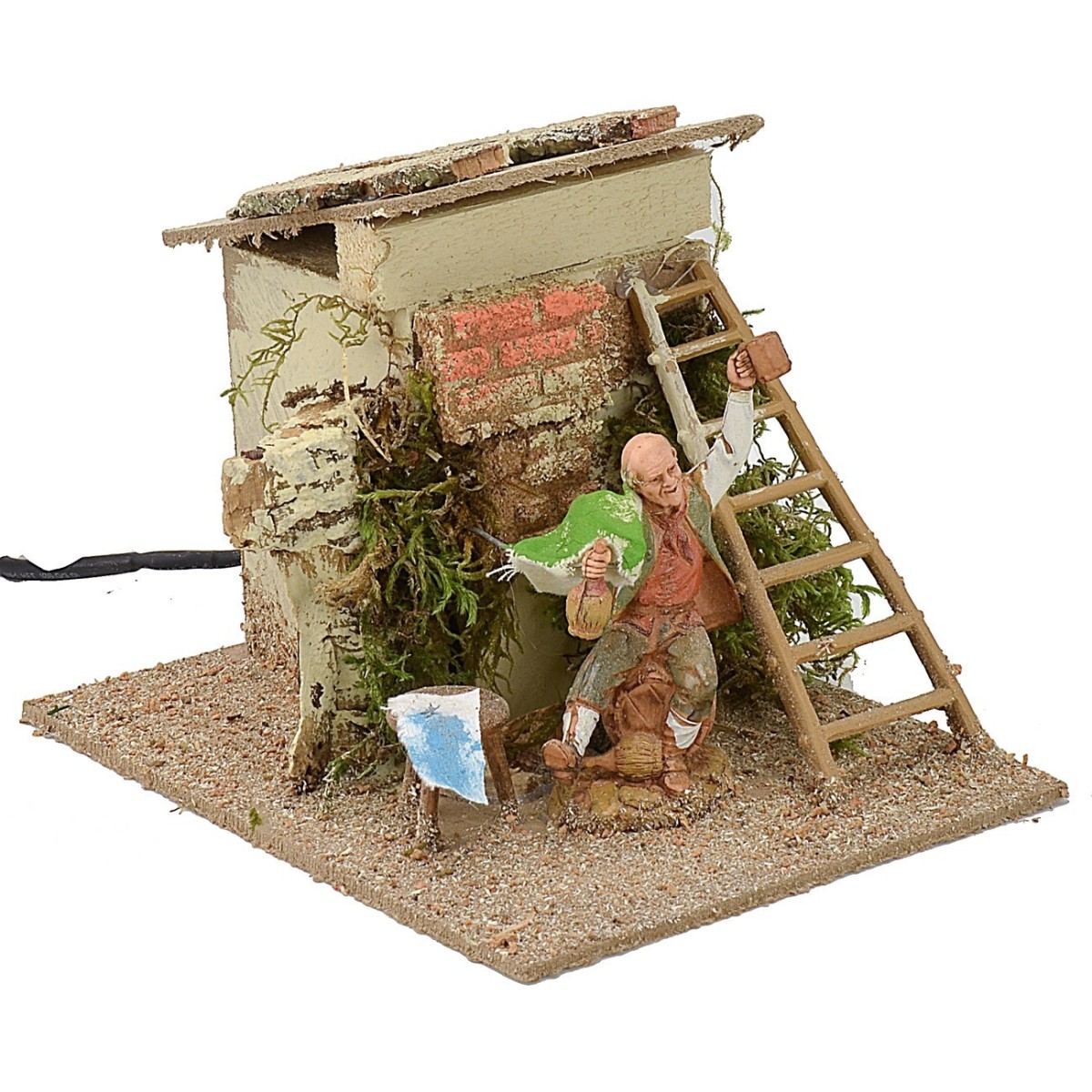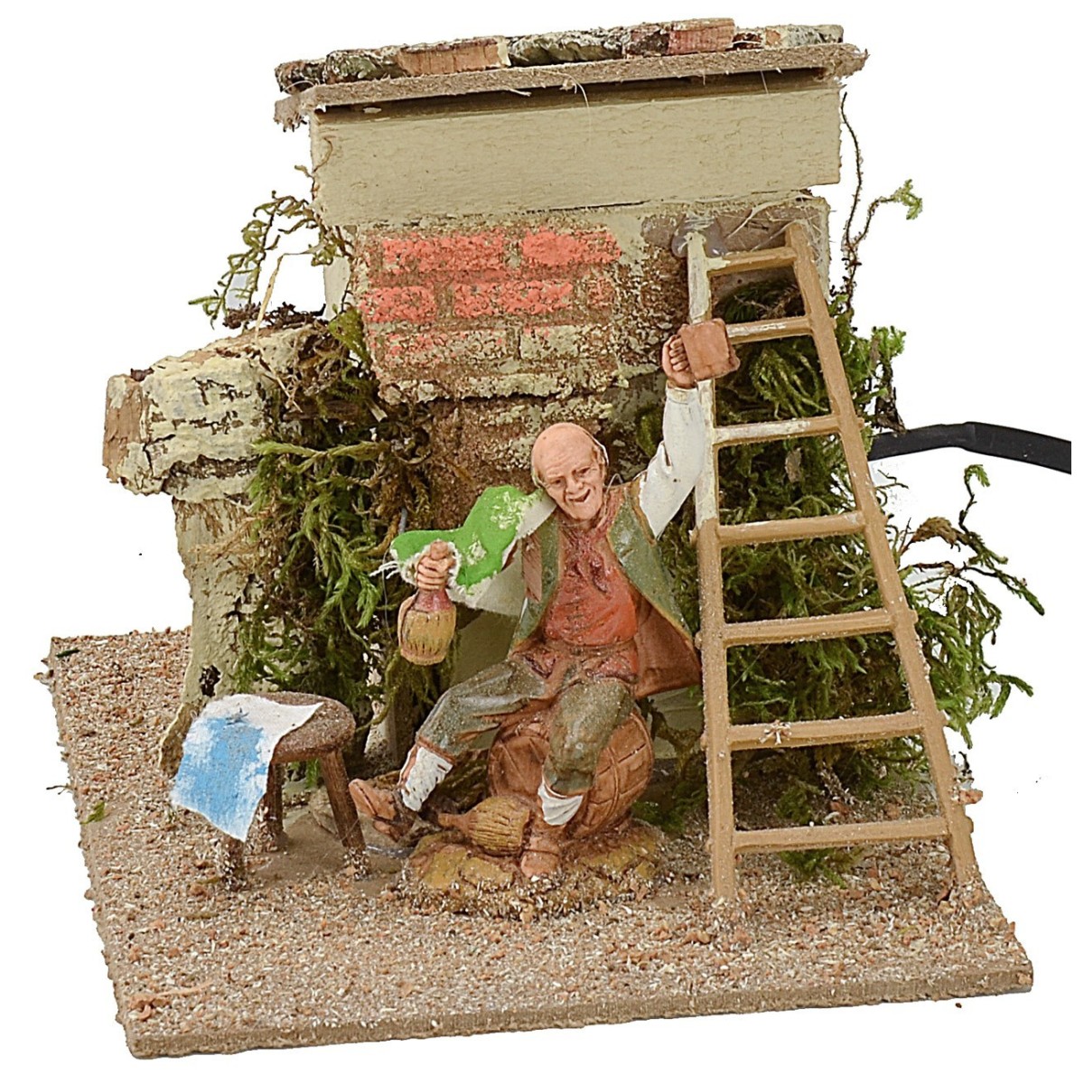 Uomo seduto che alza e abbassa il braccio tenendo in mano un fiasco. Statua per Presepe realizzata in Italia, ben rifinita nei dettagli con mantello in tessuto e volto molto espressivo. La scena è arricchita con una scala appoggiata ad un ripostiglio. L'articolo è funzionante a corrente.