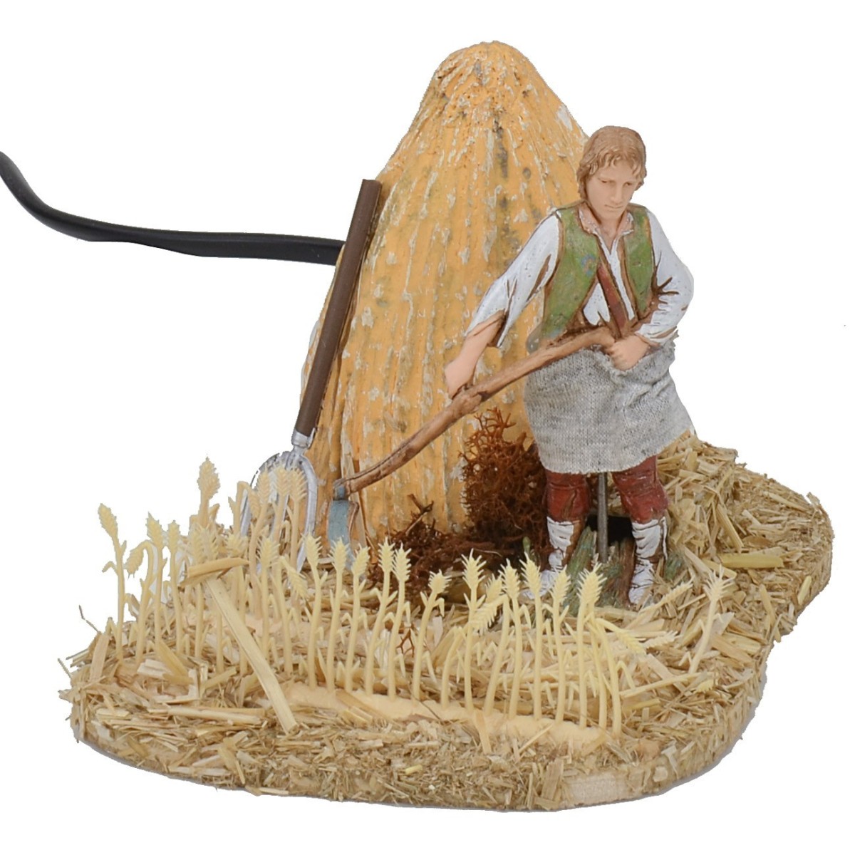 Uomo con falce in un campo di grano serie 10 cm Landi Moranduzzo in movimento ruota il busto simulando il taglio del raccolto. La scena è arricchita dal covone dove è appoggiato il forcone. Ricordiamo che la serie Landi moranduzzo 10 cm ha un'altezza reale di 9 cm. La statua presenta un viso espressivo, ogni pezzo è realizzato interamente a mano ed è funzionante a corrente.