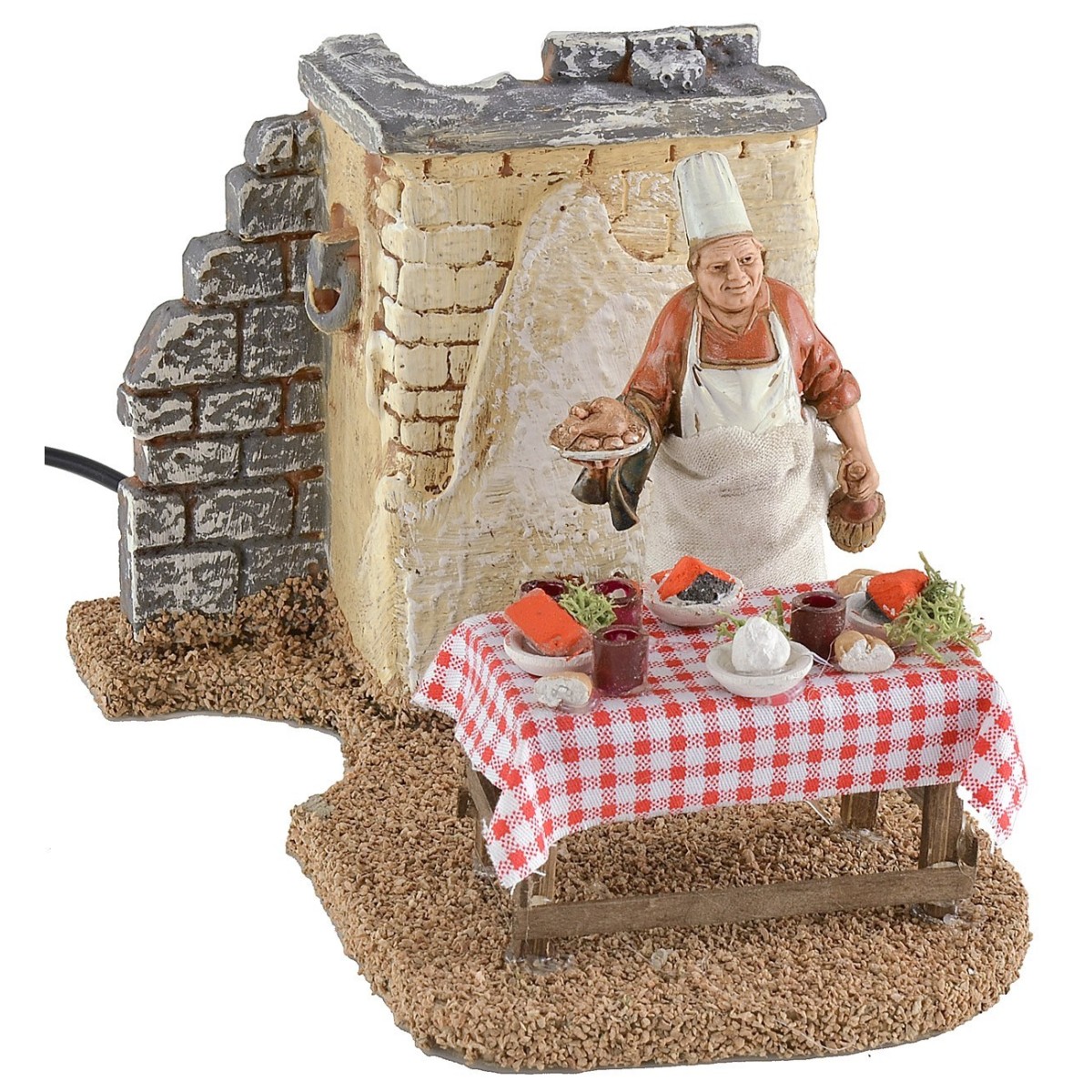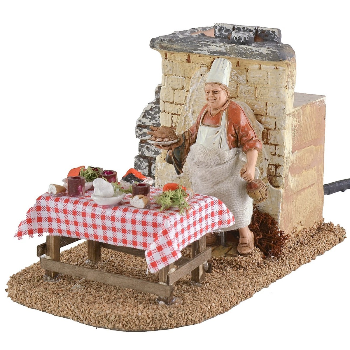 Ristoratore serie 10 cm Landi Moranduzzo in movimento che ruotando il busto simula l'azione di servire il pranzo. La scena è arricchita dalla presenza di un muro in pietra stuccato sul retro e da un tavolo imbandito di pietanze da mangiare. Questa statua presenta un viso espressivo e oltre ad essere prodotta e dipinta a mano in Italia, anche il movimento funzionante a corrente è frutto del lavoro di maestri artigiani. Ricordiamo che la serie Landi Moranduzzo 10 cm ha un'altezza reale di 9 cm.