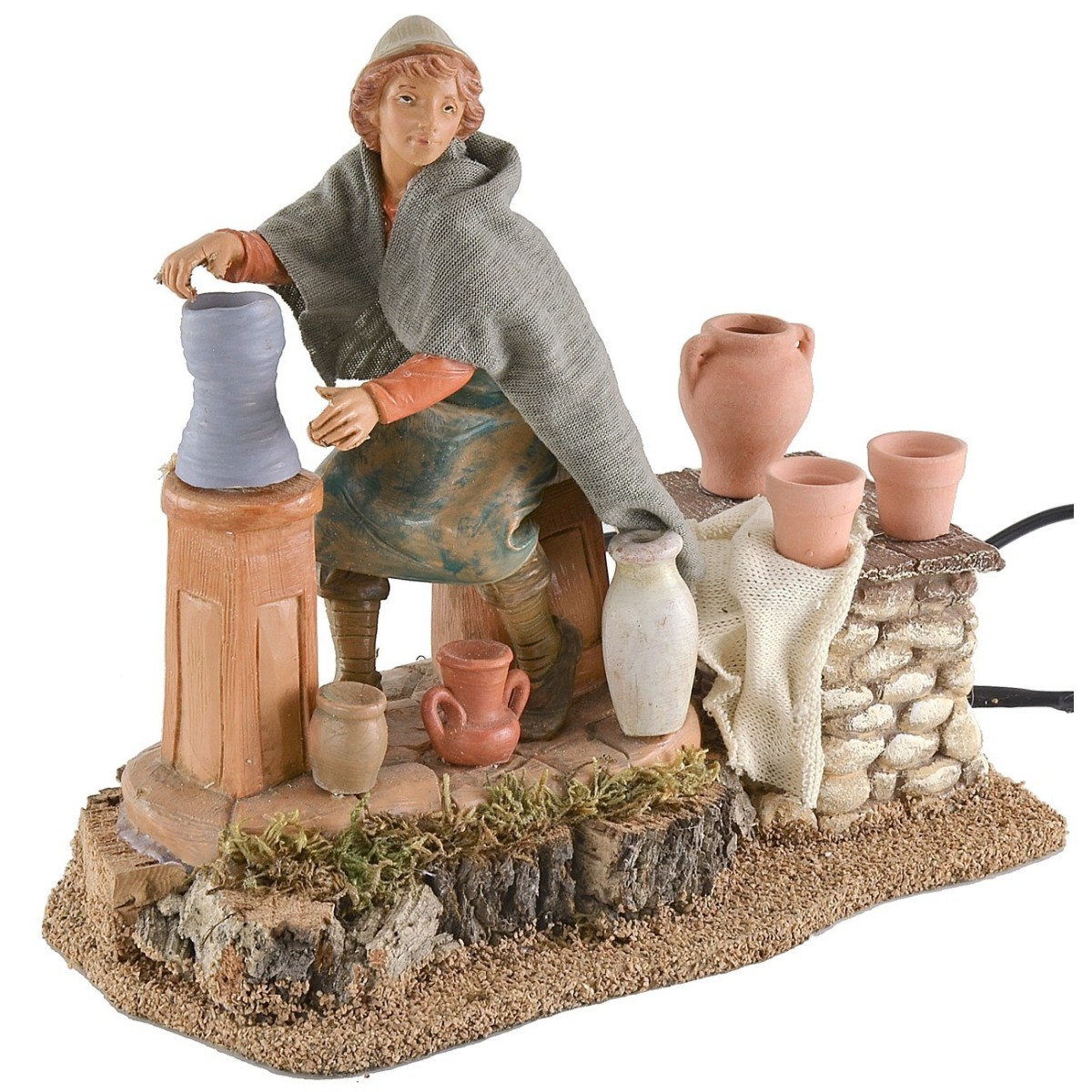 Scena con doppio movimento: un ceramista muove il braccio simulando la lavorazione del vaso di argilla che, a sua volta, gira e viene viene modellato. La statua fa parte della serie Fontanini 19 cm ed è rifinita con un mantello in tessuto. L' ambientazione per presepe è arricchita da vasellame e brocche di terracotta, oltre che da una struttura in resina a copertura della parte motore funzionante a corrente.