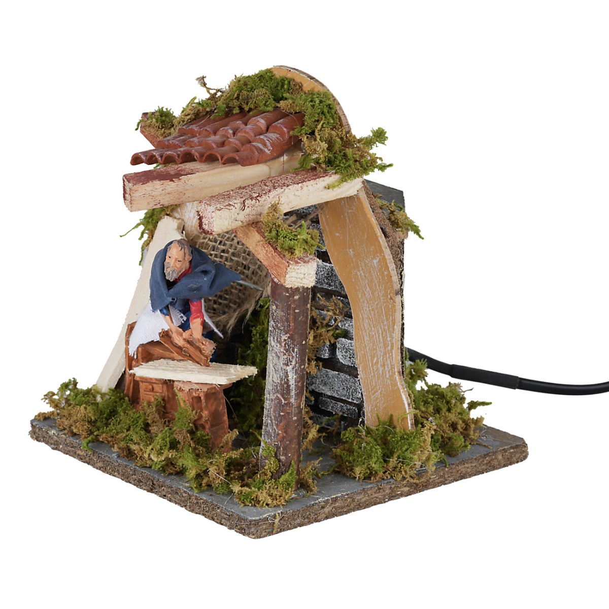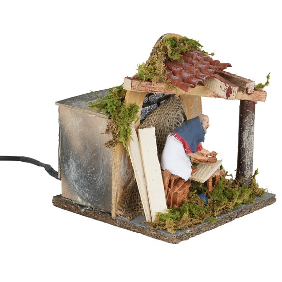 Falegname in movimento che simula l'azione di tagliare il legno. La scena è composta dal falegname che si muove in modo circolare, poggiato sul banco da lavoro sembra appunto che stia intagliando il legno. Dietro di lui una facciata di mattoni in rilievo grigi, contornati da un contorno giallo, il tutto racchiuso da delle travi su cui è poggiato un tetto a tegole rosse. Impreziosito tutto da muschio e altri pezzi di legno bianco. La figura per il Presepe classico e/o napoletano è realizzata in PVC ed è funzionante a corrente. Si precisa che i particolari del prodotto possono variare in quanto realizzato da artigiani italiani in legno, sughero e muschio.