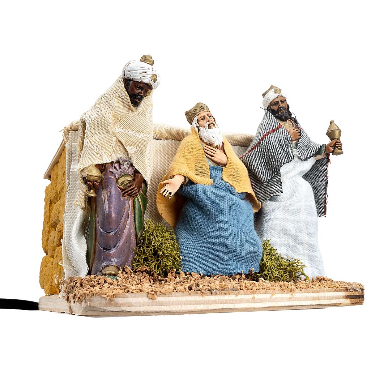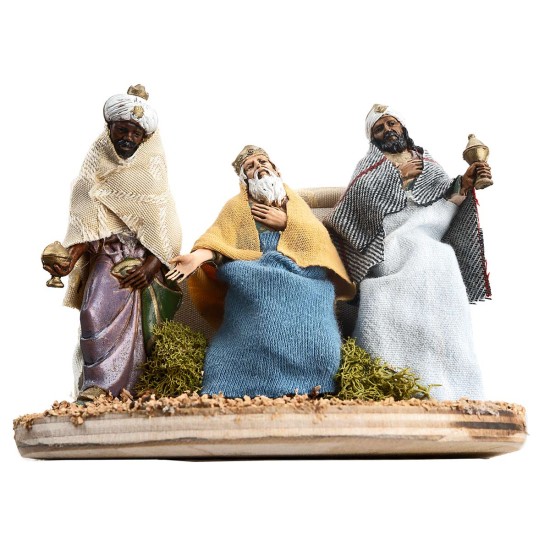 Tre Re Magi serie Landi Moranduzzo 10 cm in movimento, con due Re che si chinano e uno che ruota il busto portando i doni. La scena è realizzata artigianalmente con rivestimento in tessuto e dettagli rifiniti a mano.