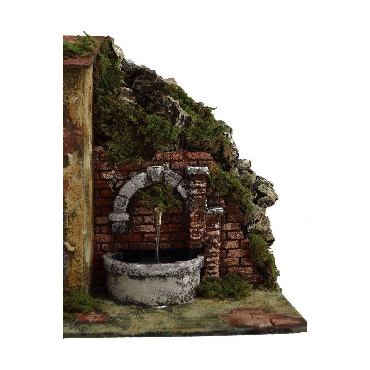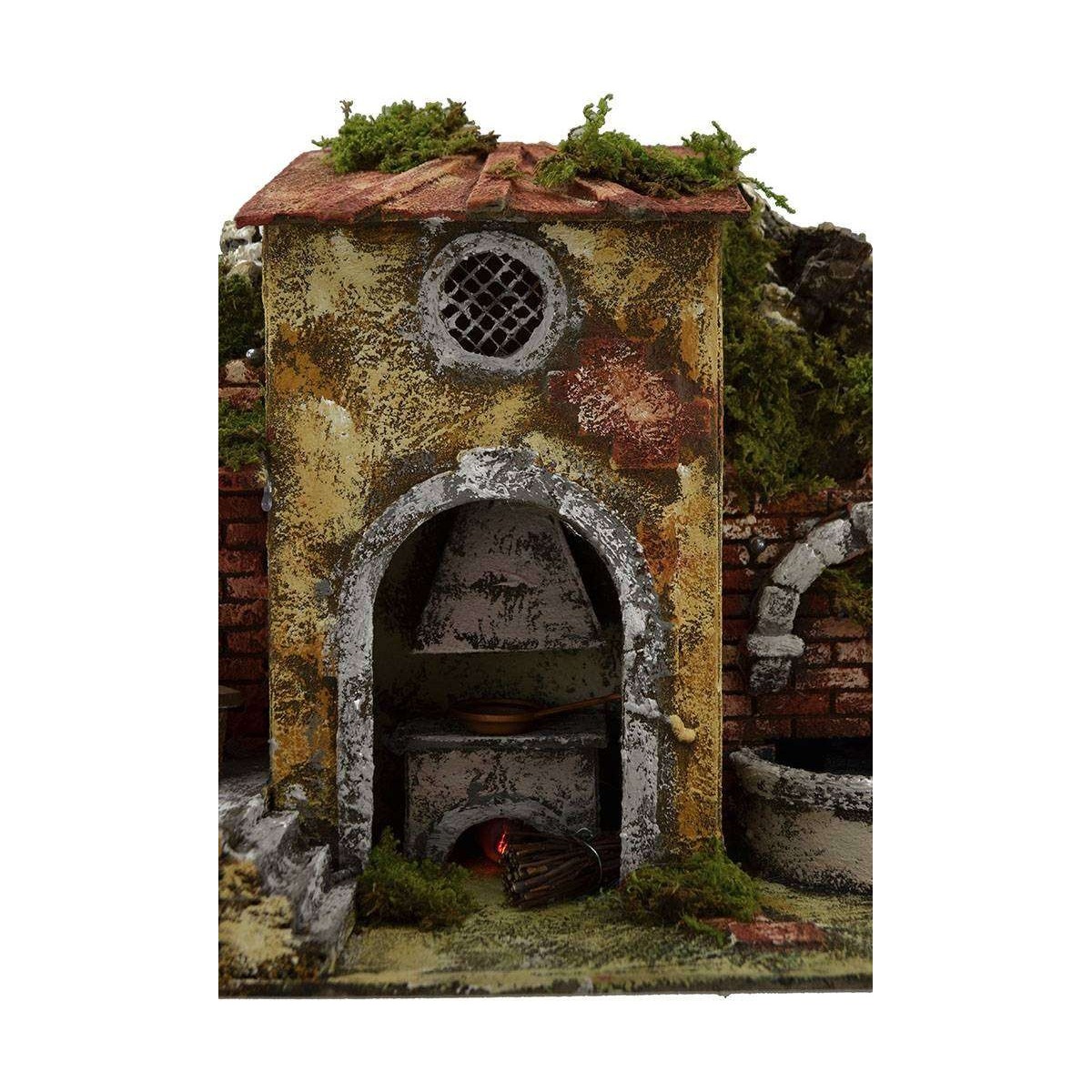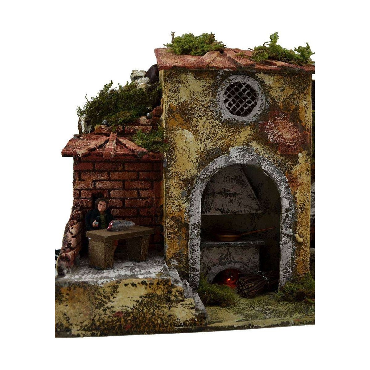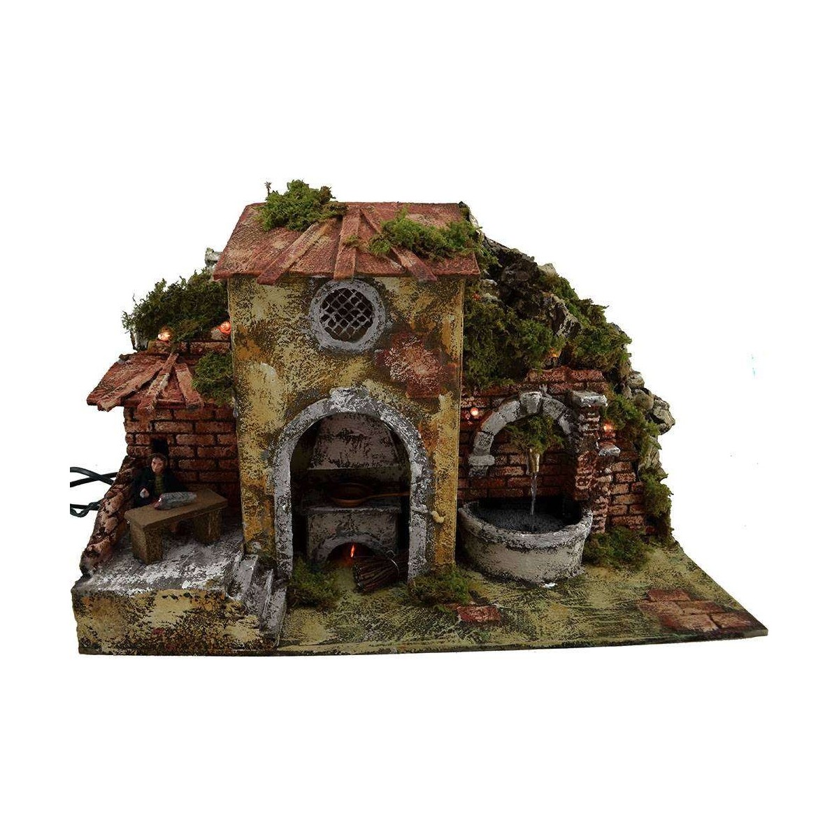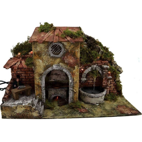 Uomo al tavolo in movimento che affetta il salame, fontana funzionante completa di pompa, forno con fuoco funzionante, illuminato con luci funzionanti a corrente.