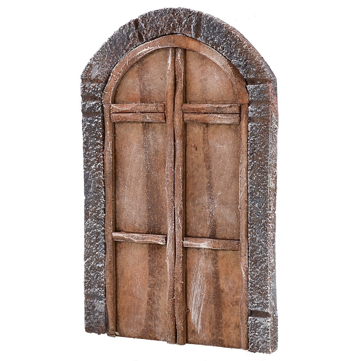 Portone in legno a due battenti con arco sovrastante, il tutto incastonato in una struttura con colonne e semicerchio di pietre. Realizzato a mano da artigiani italiani, l'articolo è ideale per la costruzione di case ed edifici per il presepe fai da te. Il portone è ben rifinito e suddiviso in sei quadranti e risulta adatto a statue di altezza cm 12-14.