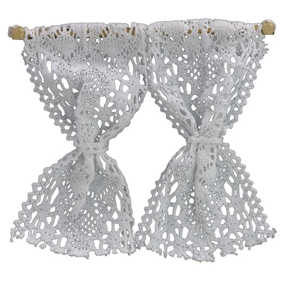 Tenda bianca in pizzo montata su bastone e arricciata, adatta a finestre e portefinestre per presepe fai da te e case di bambole.