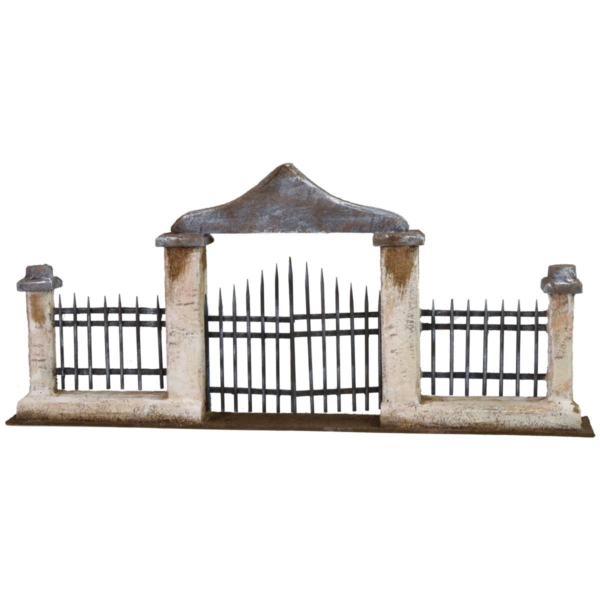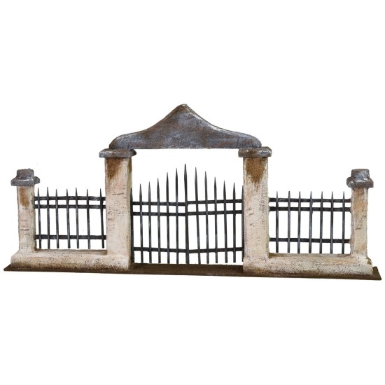 Cancello racchiuso tra due colonne che sorreggono un architrave a forma ondulata con punta centrale, ai lati è rifinito da una muraglia con ringhiera che riprende il tema principale. Il pezzo può esser utilizzato, per esempio, per delimitare la proprietà davanti ad una grande casa o ad un palazzo e risulta adatto anche per ambientazioni in stile palestinese data la particolarità della forma che richiama le sinuosità dello stile arabo. L'articolo è stato prodotto in Italia da sapienti mani artigiane con polistirene ed è consigliato per statue di altezza 10 cm.
