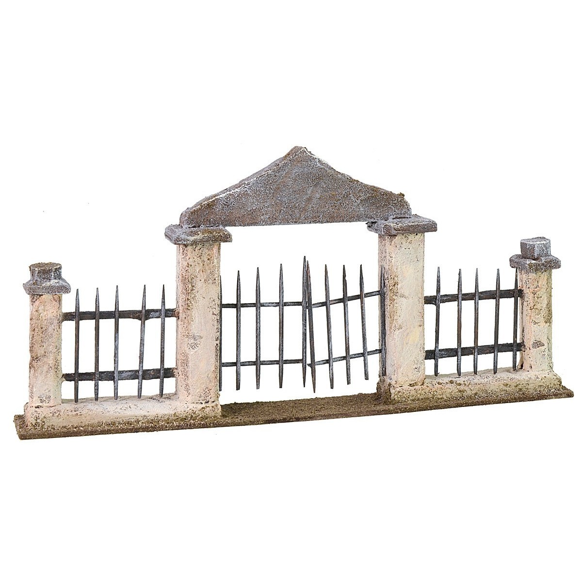 Cancello racchiuso tra due colonne che sorreggono un architrave a forma ondulata con punta centrale, ai lati è rifinito da una muraglia con ringhiera che riprende il tema principale. Il pezzo può esser utilizzato, per esempio, per delimitare la proprietà davanti ad una grande casa o ad un palazzo e risulta adatto anche per ambientazioni in stile palestinese data la particolarità della forma che richiama le sinuosità dello stile arabo. L'articolo è stato prodotto in Italia da sapienti mani artigiane con polistirene ed è consigliato per statue di altezza 6 cm.