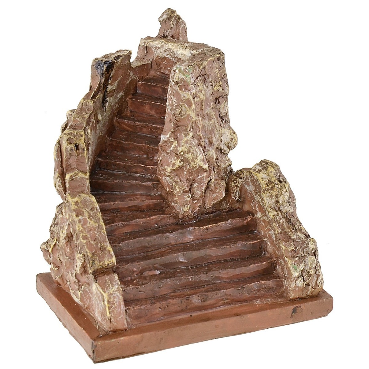 Scala in resina per presepe ricava su una parete rocciosa, gli scalini sono stati realizzati magistralmente per aumentare l'effetto profondità, infatti, in alto son più stretti e ruotano verso destra. L'articolo è consigliato a statue per presepe alte 3,5 - 4 cm.