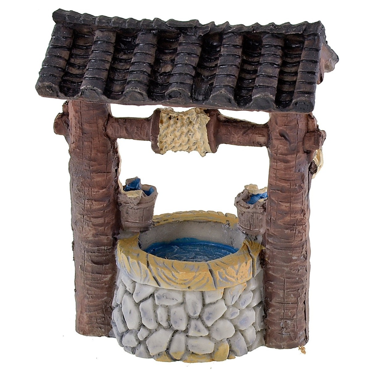 Pozzo per presepe con tettoia realizzato in resina e dipinto a mano. Il prodotto è consigliato per statuine di altezza da 6 a 6,5 cm. Il pozzo viene venduto senza la statuina presente in foto che si può acquistare separatamente sul nostro sito cliccando qui.