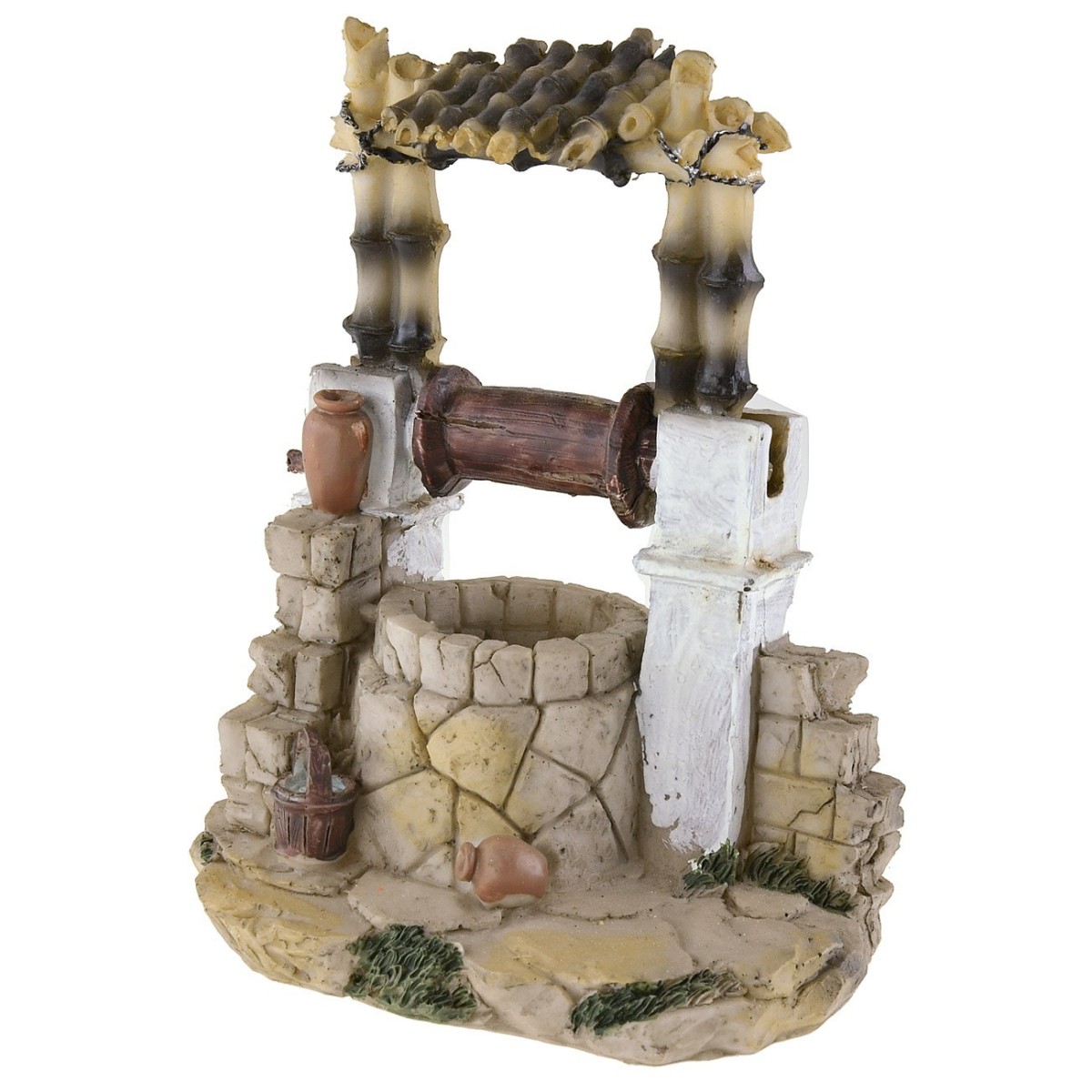 Statua per presepe in resina con al centro un pozzo di pietre bianche sovrastato da una doppia struttura. Appena sopra la cavità si trova un tronco di legno circolare utilizzato per far scorrere la carrucola, mentre più su c'è una tettoia sorretta da pali. Questa scena è completata da un'acquaiola con brocche: la statua per presepe alta 10 cm può essere posizionata a piacimento.