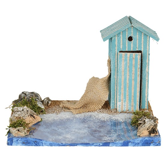 Tratto di spiaggia sabbiosa con capanno di legno dipinto di blu e decorato da linee verticali. Il mare è caratterizzato da un effetto profondità realistico che rappresenta in modo accurato il moto ondoso che raggiunge il bagnasciuga. Nei prodotti correlati è possibile trovare altri prodotti della stessa serie da poter abbinare. L'articolo è consigliato per statue alte 8-10 cm. Prodotto a mano in Italia.