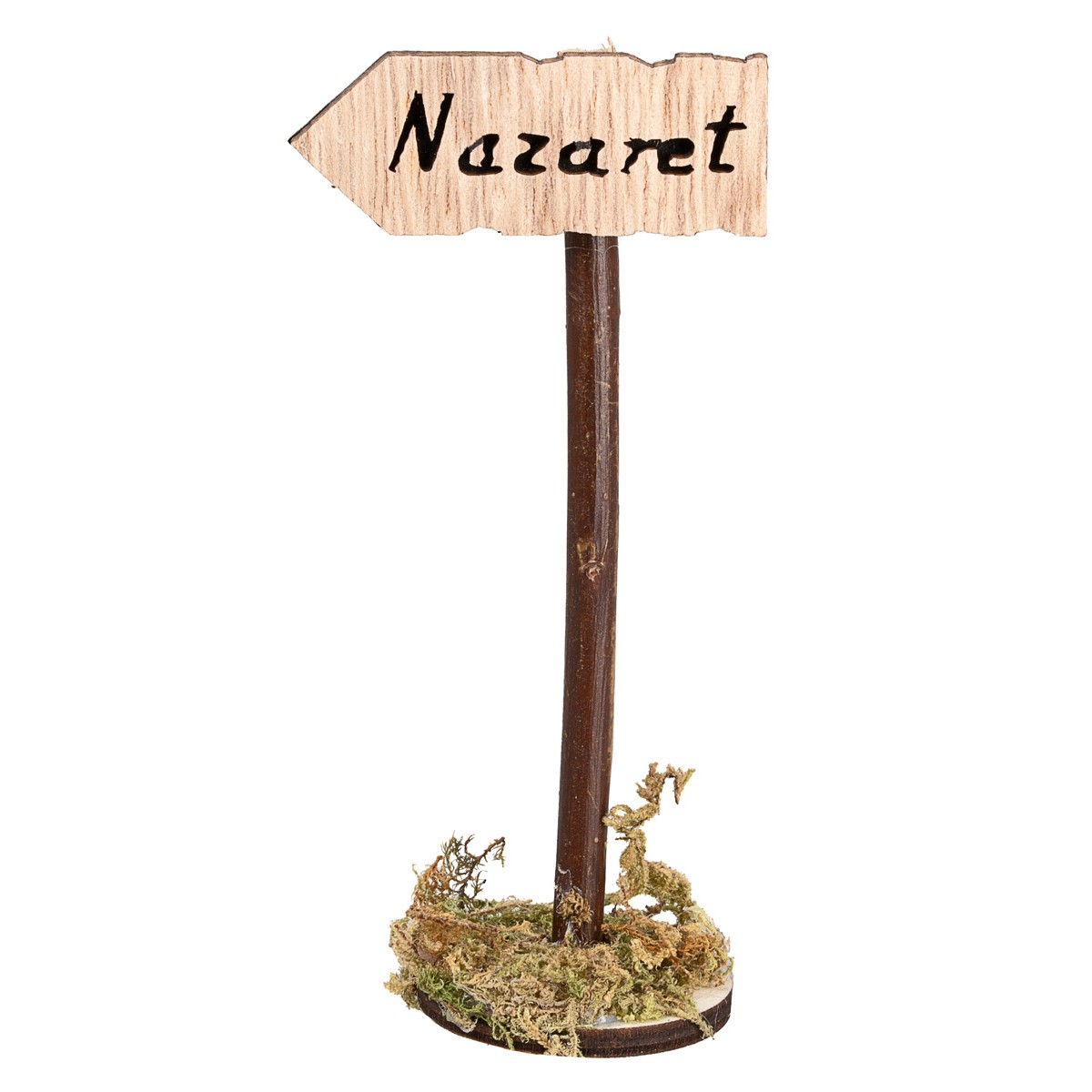 Segnale a forma di freccia con scritta "Nazaret", fissato su un palo in legno naturale e base con effetto terreno rustico.