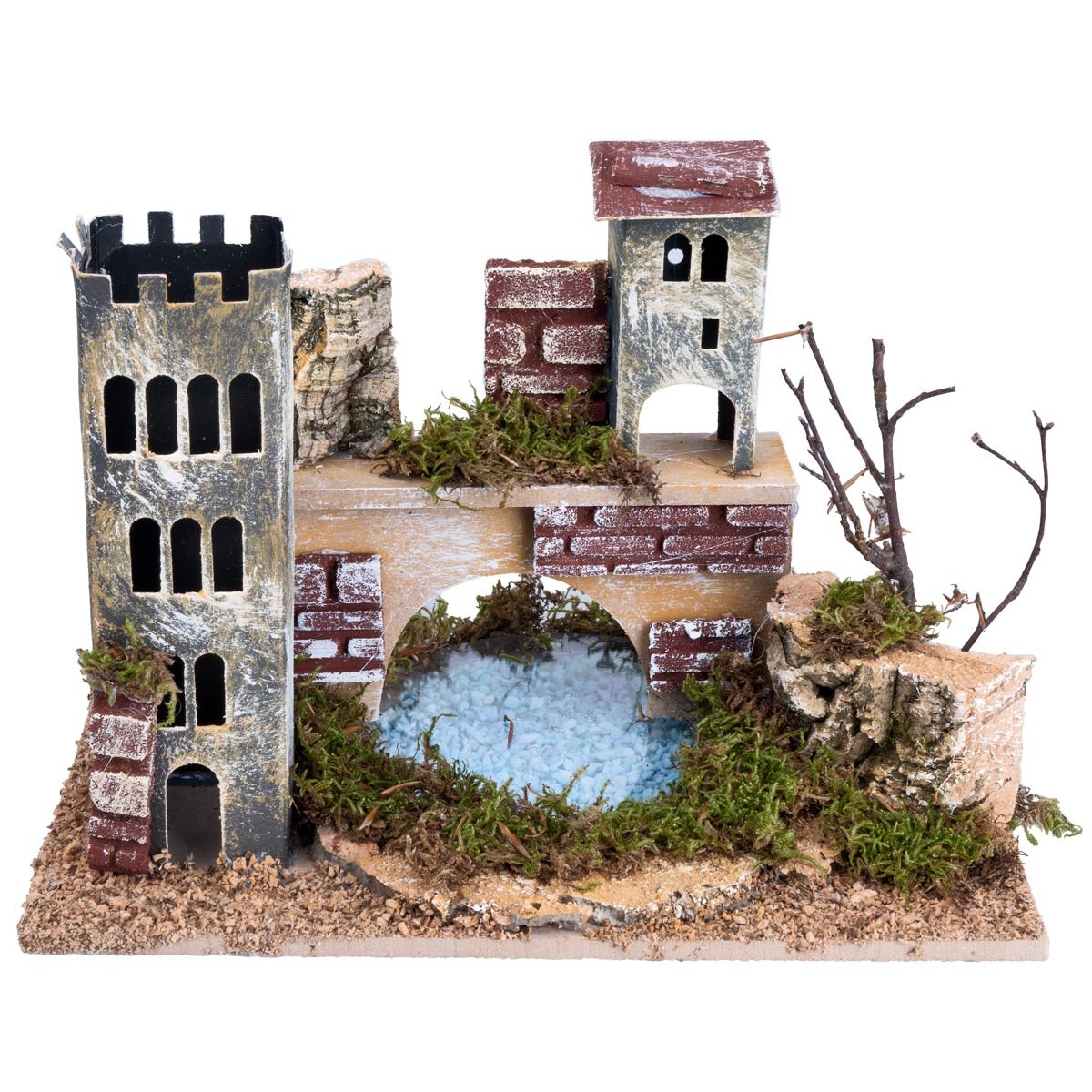 Ponte con torre e lago effetto profondità, ideale per creare ambientazioni suggestive all’interno del presepe.