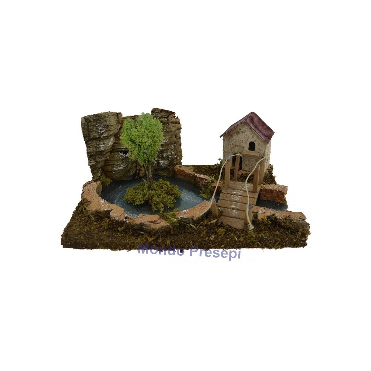 Lago effetto profondità con ponte, albero e casa. Essendo un prodotto artigianale può variare la disposizione della scena.