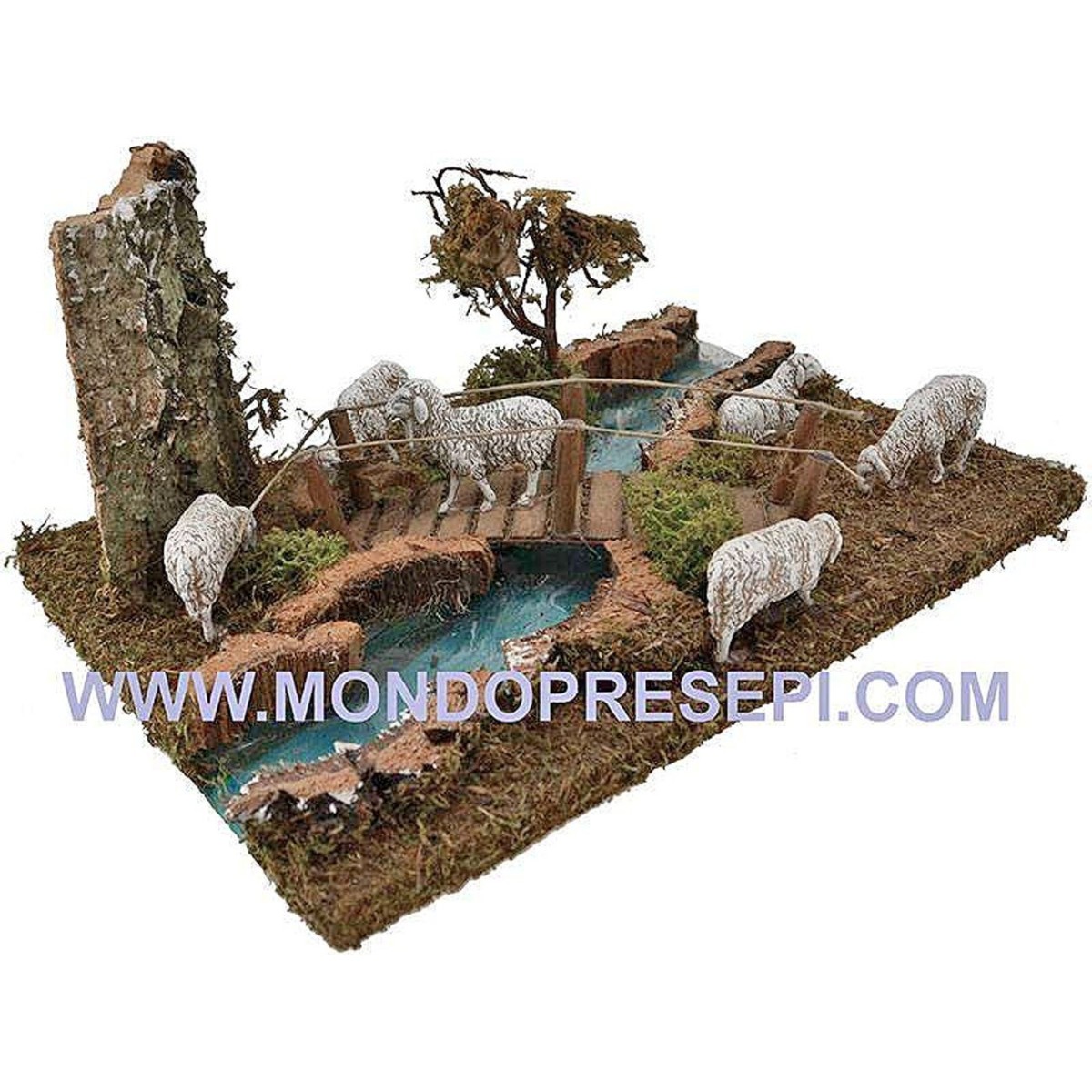 Tratto di fiume con ponte in legno. effetto profondità, con pecore serie Landi per statue cm 10.
