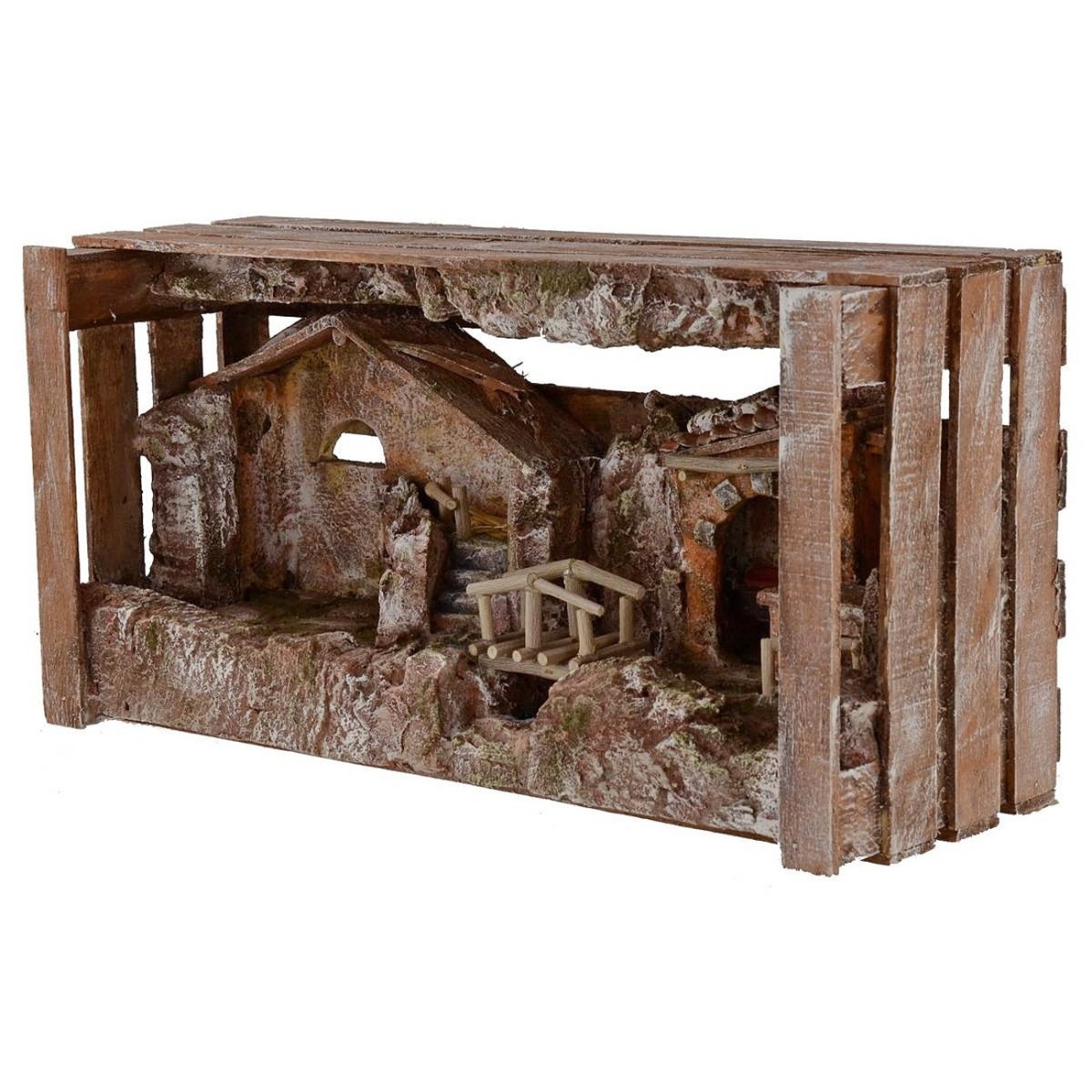 Presepe unico nel suo genere: come è possibile notare, la composizione è stata creata all'interno di un cassetta da frutta. Nella scenografia è presente una capanna vuota e, sulla destra, vi è una bottega di salumi e formaggi. Le due strutture sono separate da un finto ruscello, ma collegate da un piccolo ponte in legno. L'ambiente circostante è molto caratteristico e suggestivo: il polistirene, materiale di cui la composizione è composta, dona un realistico effetto pietra. Nella capanna, in particolare, è possibile collocare la natività Landi Moranduzzo della serie da 6 cm per comporre un presepe completo. A propria scelta, è possibile, inoltre, aggiungere dei personaggi nella bottega della medesima marca e serie. Prodotto interamente in Italia da sapienti mani artigiane, utilizzano il polistirene, legno e sughero.