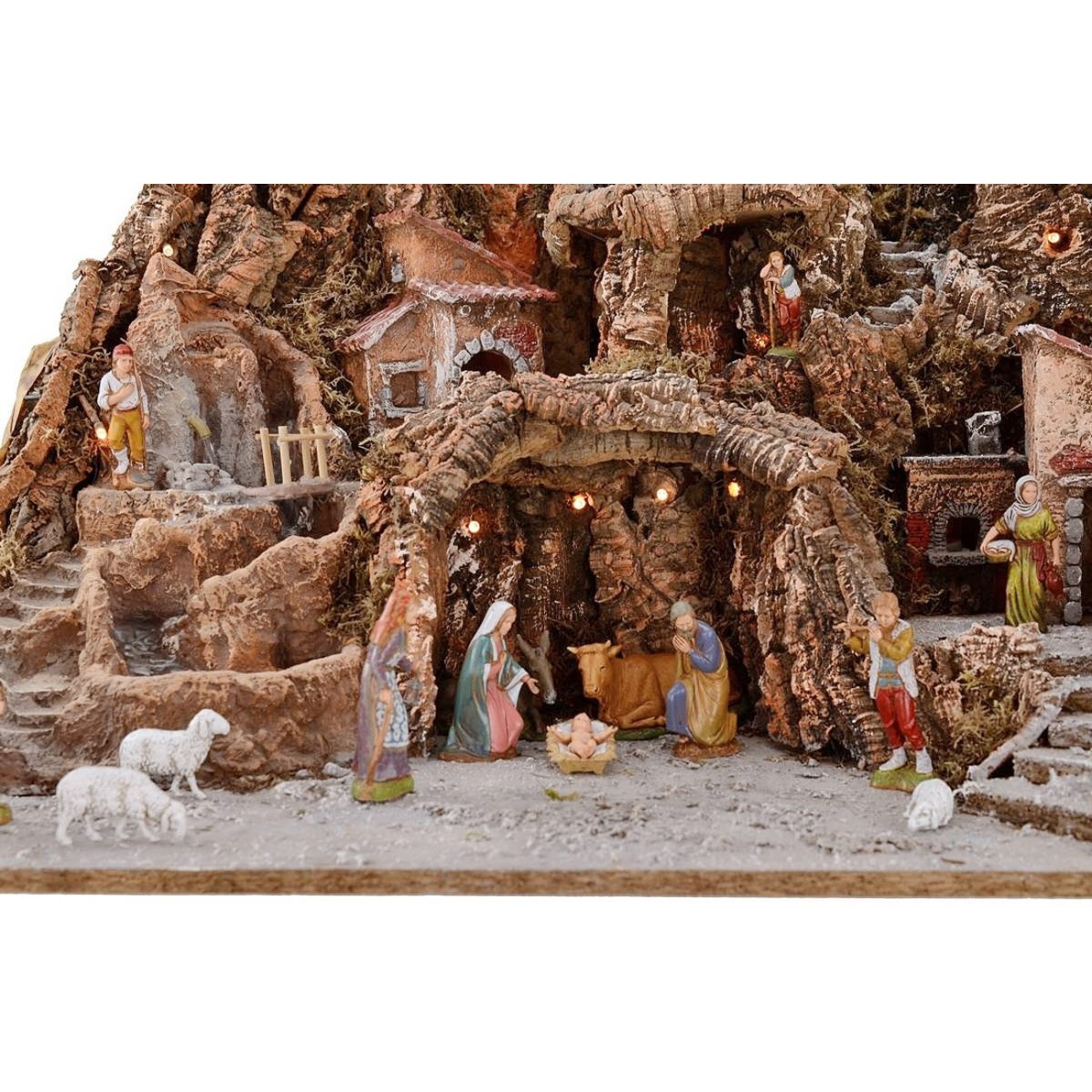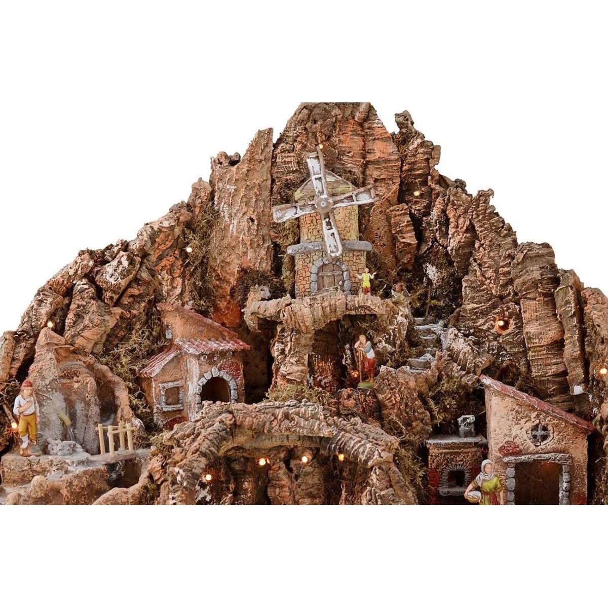 Presepe illuminato completo di statue Landi Moranduzzo serie cm 6-8-10, con fontana da cui sgorga l'acqua che scende in cascata completa di pompa, mulino a vento con pale rotanti e luci funzionanti a corrente. In primo piano sono presenti dodici personaggi della serie Landi Moranduzzo di altezza 10 cm, inclusa la Natività collocata nella grotta e le tre pecorelle; in lontananza sono presenti due figure da 8 cm della stessa serie e una figura da 6 cm situata in cima al Presepe, vicino al mulino a vento. Ricordiamo, inoltre, che la serie Landi Moranduzzo da cm 10 ha un'altezza reale di circa cm 9; mentre la serie da 8 cm ha un'altezza reale di circa 7 cm. Si precisa che il numero delle statuine rimarrà sempre uguale alla foto, i soggetti potrebbero essere sostituiti con altri della serie Landi Moranduzzo in base alle disponibilità. Prodotto realizzato interamente da sapienti mani artigiane.