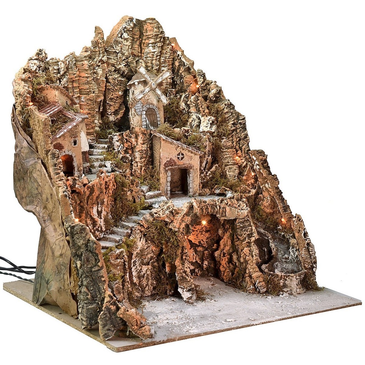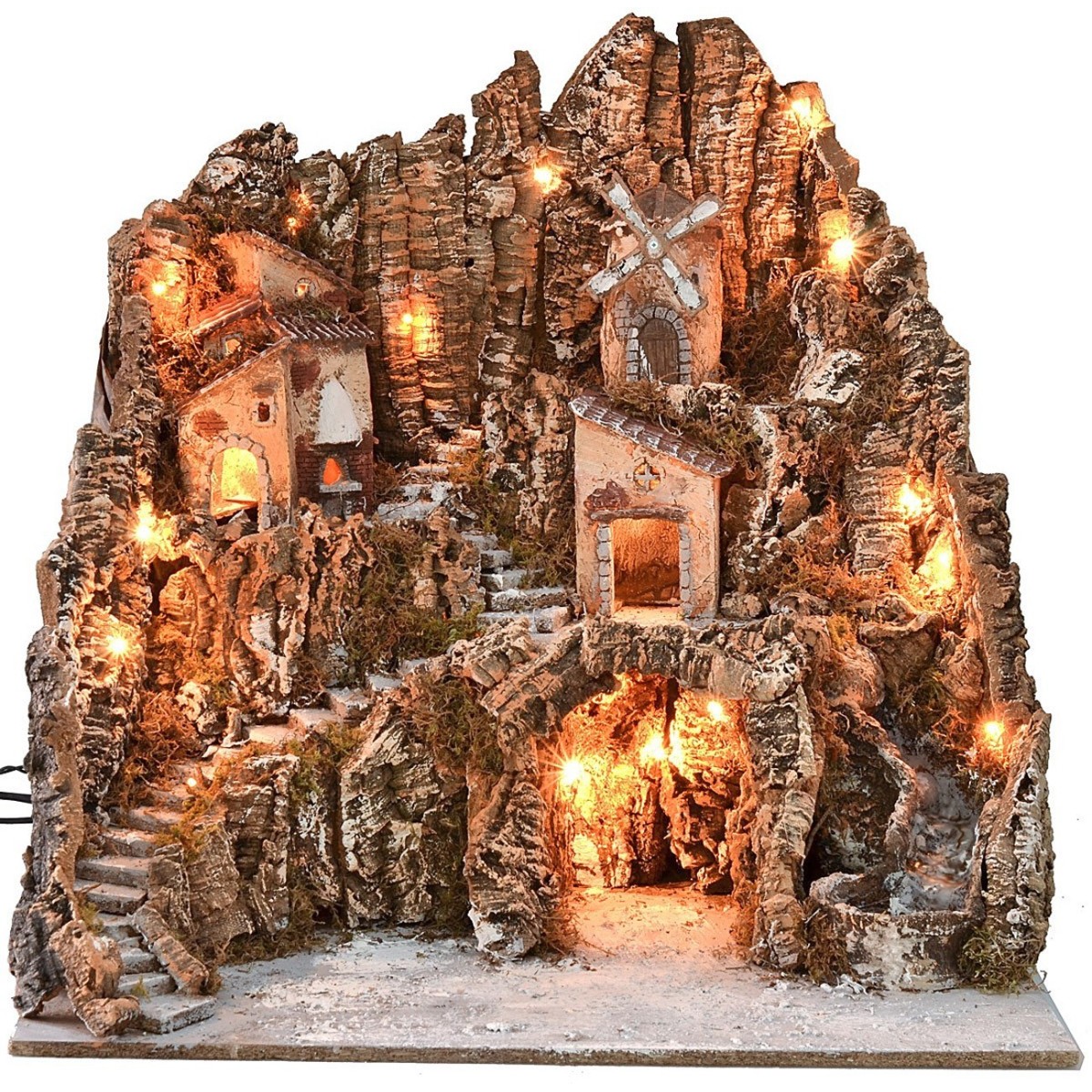 Presepe illuminato con mulino a vento, cascata e forno funzionanti cm 60x50x65 h