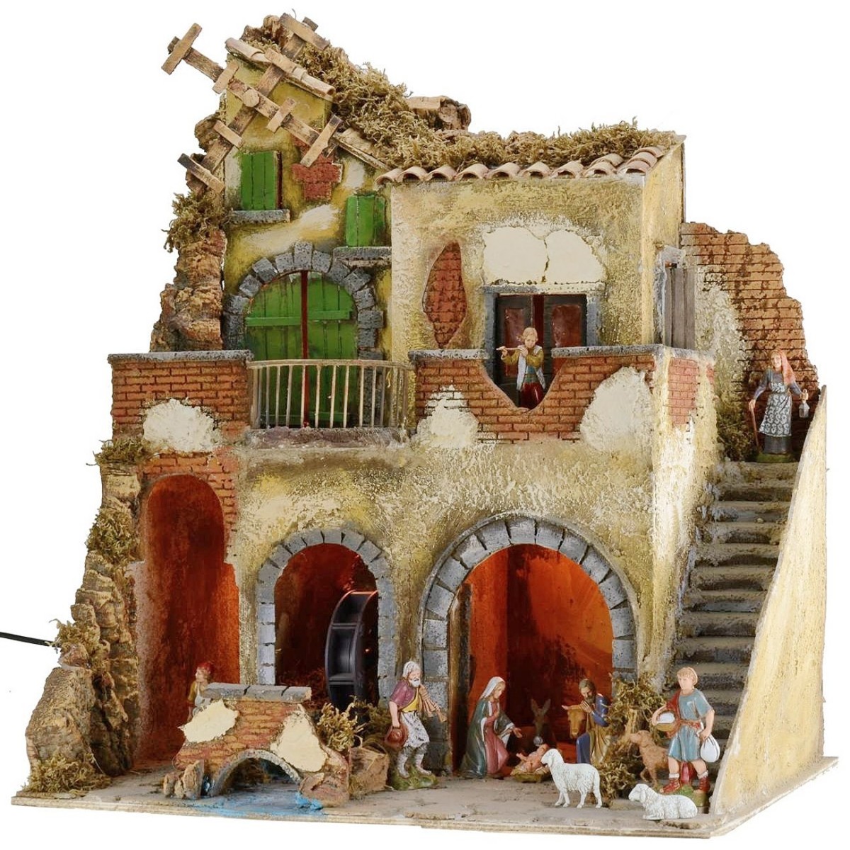 Presepe artigianale illuminato in stile classico napoletano, completo di statue della serie Landi Moranduzzo, caratterizzato dalla presenza di un mulino ad acqua nella parte inferiore e di un mulino a vento nella parte superiore.
