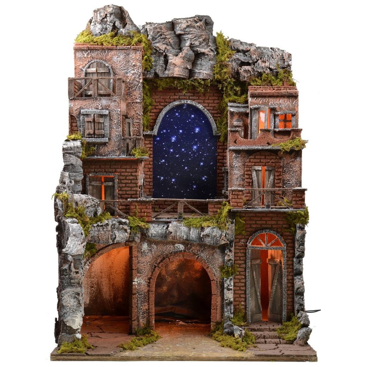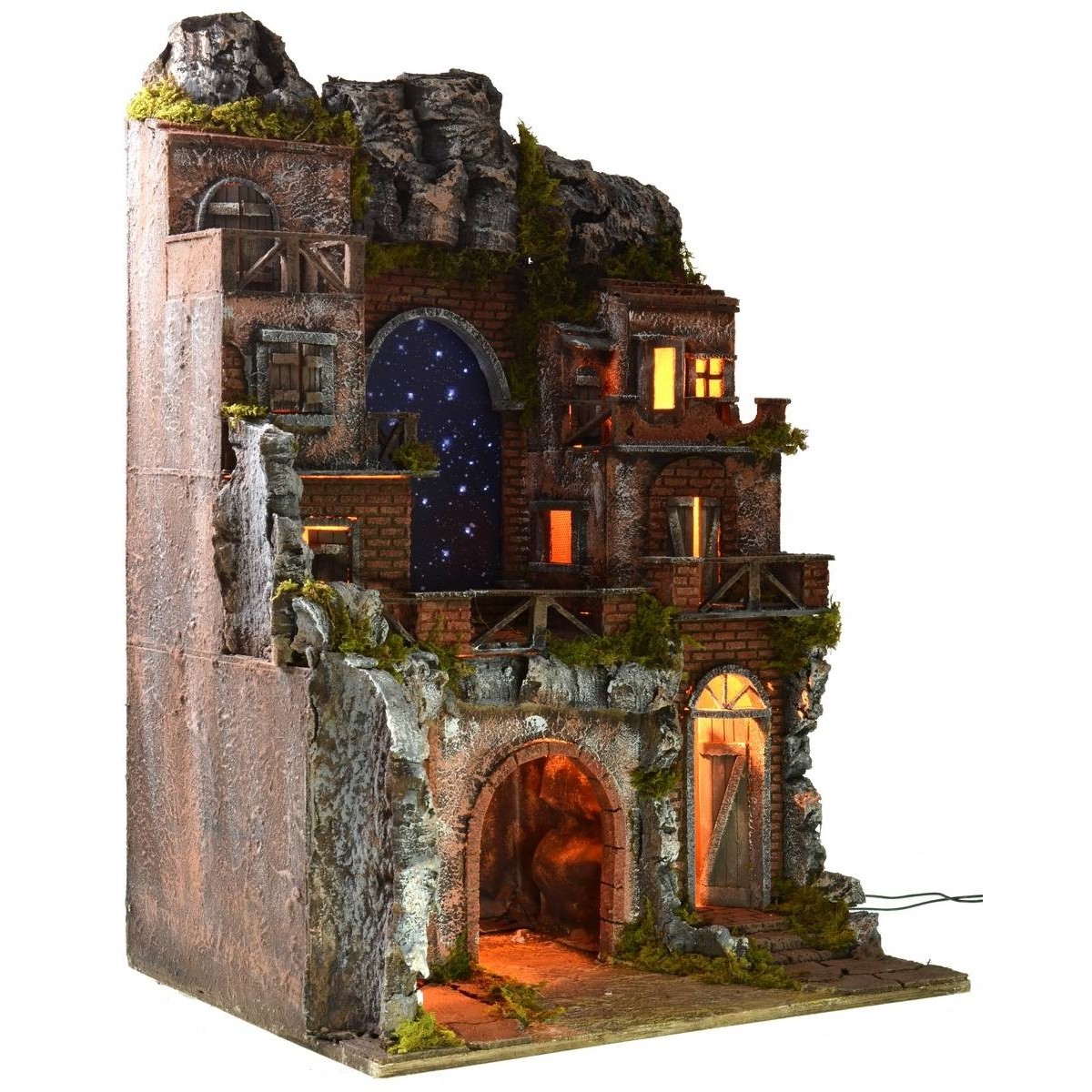Presepe artigianale dallo stile classico-napoletano illuminato da luci calde funzionanti a corrente e da un pannello con cielo stellato a fibre ottiche, dall'effetto tremolante, funzionante a batteria (2 pile AA non incluse). La scenografia si presenta ben rifinita nei dettagli e si sviluppa in altezza: al piano inferiore, troviamo due ampie grotte dove sarà possibile posizionare statue di Natività di altezza consigliata 12 cm; e troviamo, inoltre, un portone d'ingresso a doppio battente in legno semi aperto, dal quale è possibile accedere al piano superiore. Qui, sono presenti delle abitazioni con cortile comune, dove sarà possibile collocare statue di altezza consigliata 10 cm. In base ai propri gusti ed esigenze, sarà possibile accentuare la prospettiva utilizzando anche statue da 8 cm. Regalano un'atmosfera suggestiva le luci, funzionanti a corrente ed il pannello con cielo stellato a fibre ottiche, funzionante a batterie. Inoltre, l'utilizzo del muschio e della corteccia rende il paesaggio molto realistico, in quanto fitto di verde vegetazione e pareti rocciose circostanti. Articolo realizzato interamente in Italia da sapienti mani artigiane, utilizzando il sughero, il legno ed il muschio. Nei prodotti correlati è possibile visionare alcune statue di Natività di altezza 12 cm.
