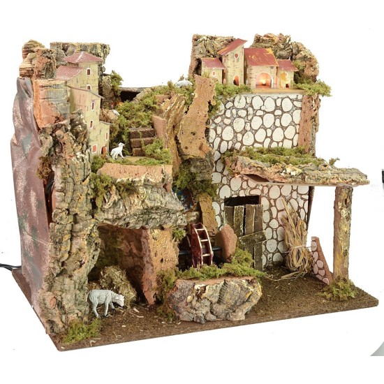Presepe illuminato con cascata e mulino funzionante, il paesaggio montano è caratterizzato da terrazzamenti su diversi livelli che permettono di creare movimento ed enfatizzare l'effetto prospettico. Al centro, in primo piano si trova la cascata da dove sgorga l'acqua che fa girare il mulino, il movimento è dato da una pompa a riciclo continuo funzionante a corrente. A sinistra una grotta, mentre a destra davanti al portone di legno una pergola coperta in sughero, entrambi gli spazi possono essere utilizzati per collocare la Natività. Sulle alture si trovano tante casette e alcune pecorelle. Il Presepe fatto con legno sughero e muschio, è completo di luci alimentate a corrente.