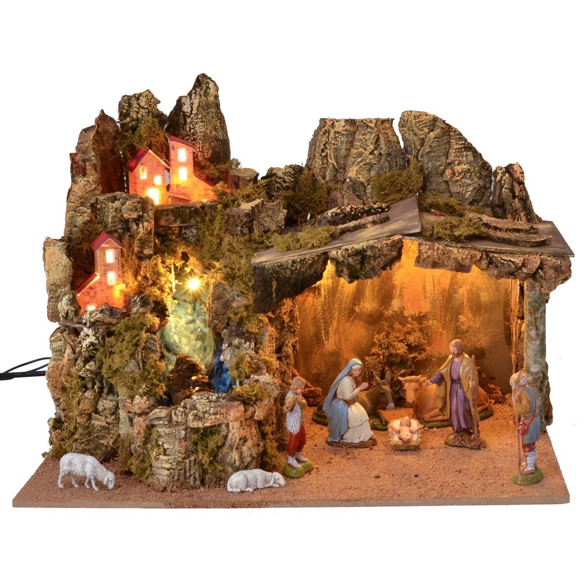 Presepe completo di statue, luci e cascata funzionanti a corrente e completa di pompa. La scenografia si presenta ben rifinita nei dettagli: sulla destra è presente una grotta dov'è collocata la Natività cm 10-12. Sulla sinistra, invece, è presente un ruscello funzionante che si sviluppa sulle alture e scende in cascata verso il basso, dove è presente una vasca delineata da un muretto effetto roccia. Un elemento caratteristico è la verde e fitta vegetazione circostante che rende il paesaggio molto realistico. Nel Presepe sono incluse statue della serie cm 10-12. L'illuminazione funzionante a corrente rende suggestivo il paesaggio. Articolo realizzato interamente in Italia da sapienti mani artigiane, utilizzando il legno, il sughero ed il muschio. Si precisa, inoltre, che il numero delle statuine rimarrà sempre invariato rispetto alla foto, ma i soggetti potrebbero essere sostituiti con altri della stessa serie in base alle disponibilità.