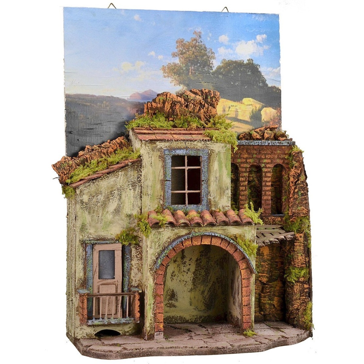 Presepe artigianale in stile napoletano con quadro come sfondo che permette di essere appeso. Sullo sfondo vi è un cielo azzurro con delle nuvole bianche, un albero e dei monti in lontananza. In primo piano in rilievo invece vi è un edificio nella cui parte centrale ci sono dei mattoni rossi che formano un arco sopra il quale vi è una grande finestra. Alla destra dell'arco c'è una porta grigia mentre sulla sinistra, all'altezza della finestra ci sono tre archi più piccoli, sempre in mattoni rossi. L'articolo è realizzato in legno, muschio e sughero. E' consigliato per statue di altezza circa 10 cm.