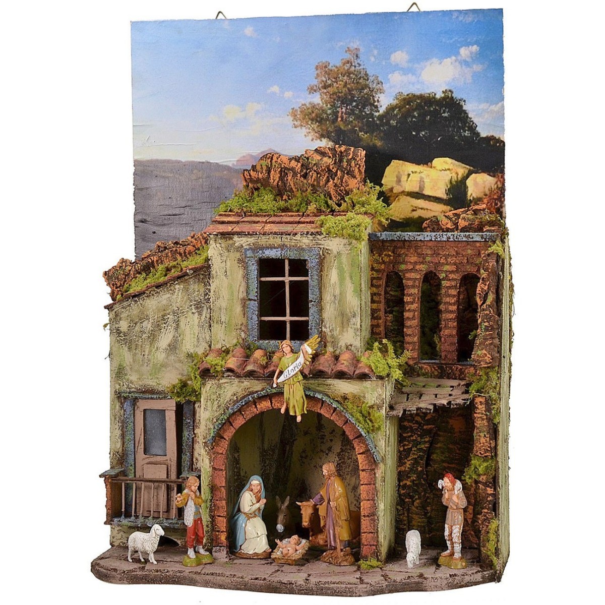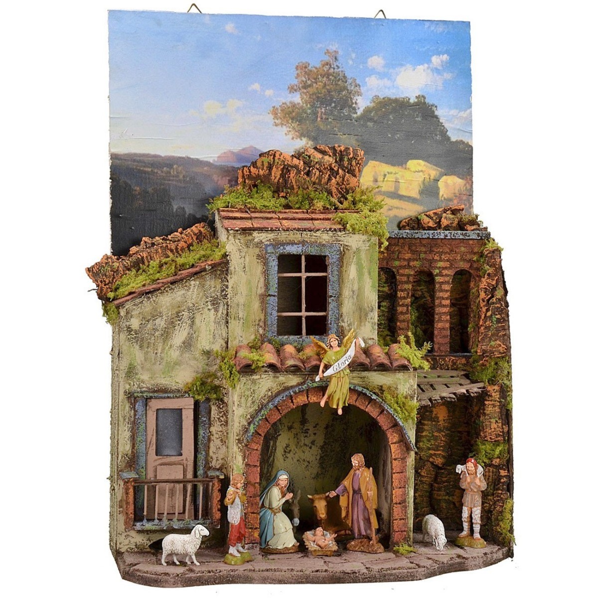 Presepe artigianale in stile napoletano con quadro come sfondo che permette di essere appeso.