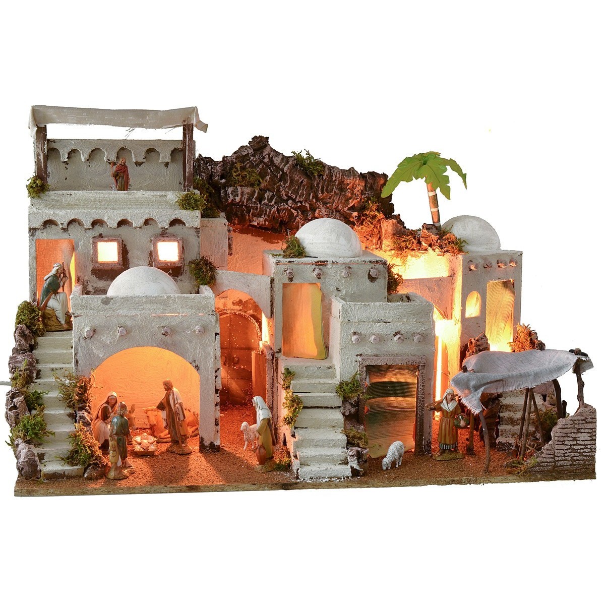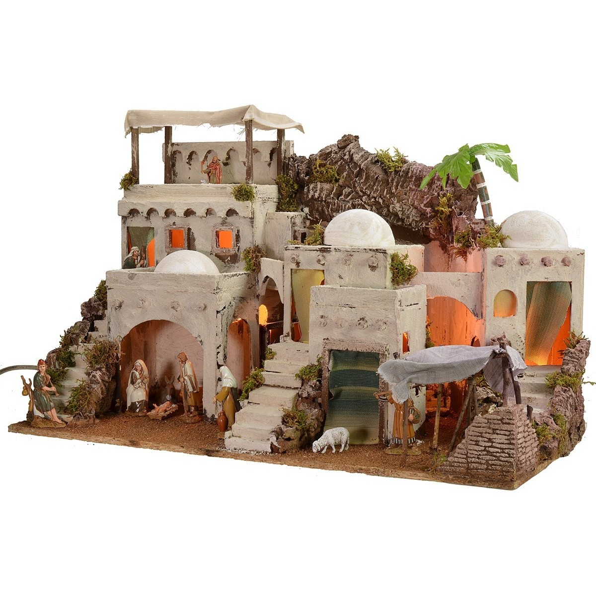 Presepe Palestinese illuminato con bivacco funzionante a corrente. La struttura è composta da abitazioni a più livelli con caratteristiche arabeggianti, ogni casa è collegata all'altra da archi. A sinistra in basso troviamo un grande spazio semiaperto dov'è riposta la Natività serie cm 10 Landi Moranduzzo costumi storici, mentre a fianco una scala che porta ai piani superiori dov'è installata una grande tenda. Sul lato destro, dietro al muretto, è presente un bivacco funzionante a corrente coperto da un'altra struttura in legno e tessuto. In ultimo piano la parete rocciosa con una palma a decorare l'ambientazione. Il presepe è completo di statue Landi costumi storici della serie 10 cm, che misura realmente circa 9cm. Si precisa che il numero di statue della serie indicata rimarrà sempre il medesimo come mostrato in foto, potrebbero cambiare i soggetti a seconda delle disponibilità del momento.