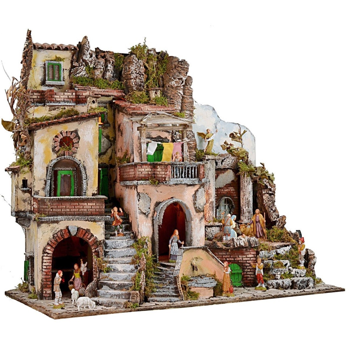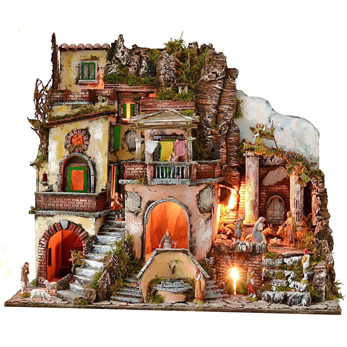Presepe artigianale illuminato in stile napoletano caratterizzato da una fontana funzionante a corrente in primo piano, dietro si ergono delle abitazioni a più livelli molto caratteristiche con i panni stesi sul balcone, la struttura prosegue a sinistra dove al piano terra si trova un arco con all'interno un forno con fuoco funzionante. Oltre alla scalinata a sinistra che separa le abitazioni, ne è presente un'altra a destra che porta ad un vecchio tempio, caratteristiche le colonne davanti a cui è collocata la natività. Le luci di cui è già provvisto il presepe regalano un'atmosfera suggestiva ed illuminano tutto il paesaggio, oltre al forno e al gioco d'acqua della fontana. L'articolo è stato realizzato interamente in Italia da sapienti mani artigiane, utilizzando legno, sughero e muschio. Precisiamo che la serie Landi Moranduzzo cm 10 ha un'altezza reale di circa cm 9. Si precisa, inoltre, che il numero delle statuine rimarrà sempre uguale alla foto, ma i soggetti della medesima serie Landi Moranduzzo potrebbero in base alle disponibilità.