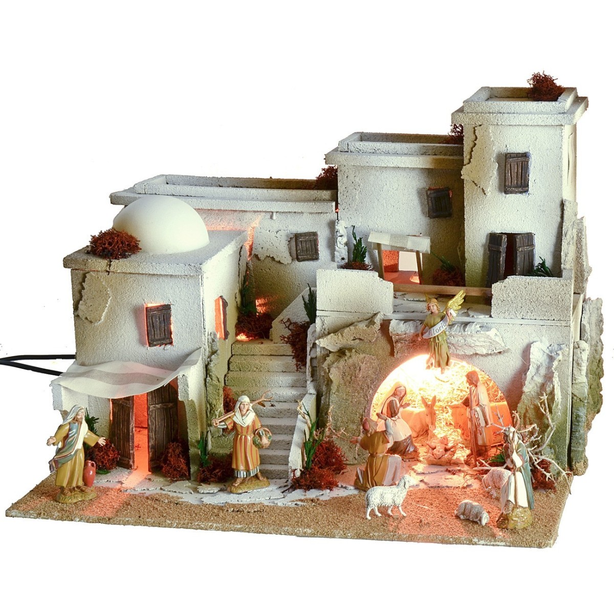 Presepe in stile arabo costituito da abitazioni bianche a più livelli caratterizzate da tetti piani e cupola. La struttura è nel suo complesso ben rifinita con pareti che riprendono l'effetto pietra e la scena risulta colorata grazie ai licheni ed alla vegetazione. A sinistra, in primo piano, una grande tenda davanti al portone, affiancata da una scalinata centrale che porta ai piani superiori, seguita a destra da un ampio ambiente con apertura ad arco dove è collocata la Natività. Questo pezzo è già completo di luci che renderanno ancora più suggestivo il vostro presepe e fa parte di una serie componibile per cui sarà possibile ampliare il paesaggio, tutti i pezzi compatibili li trovate disponibili sotto la tabella nei prodotti correlati. L'articolo è stato prodotto da artigiani italiani ed è completo di statue serie Landi costumi storici 10 cm che hanno un'altezza reale di circa 8,5 cm; inoltre il Presepe verrà consegnato con il medesimo numero di statue come mostrato in foto, potrebbero cambiare i soggetti a seconda delle disponibilità del momento.