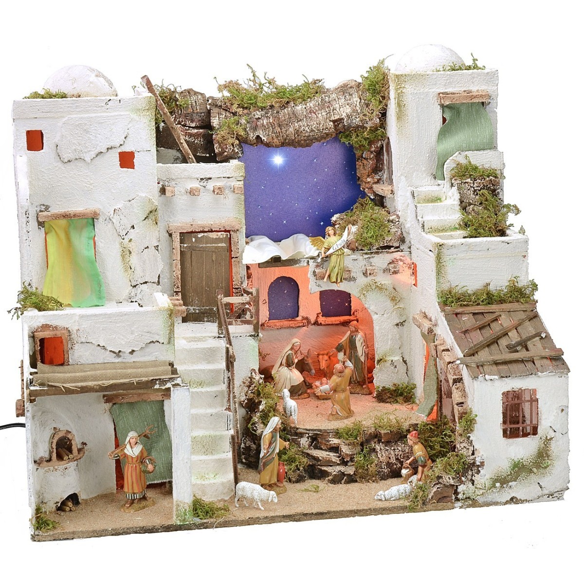 Presepe in stile arabo completo di luci e forno effetto fuoco funziontati a corrente, oltre che da un cielo stellato a fibre ottiche funzionante a batterie. La struttura è caratterizzata da un borgo di abitazioni bianche a più livelli con i classici tetti piani e le cupole. La scena è colorata grazie alla vegetazione, oltre che alle tipiche tende poste davanti agli ingressi delle case. L' articolo è stato prodotto da artigiani italiani con legno, sughero e muschio. Il Presepe è completo di statue 10 cm Landi costumi storici che misurano realmente 8,5 cm, inoltre verrà consegnato con il medesimo numero di statue come mostrato in foto ma i soggetti potrebbero variare a seconda delle disponibilità.