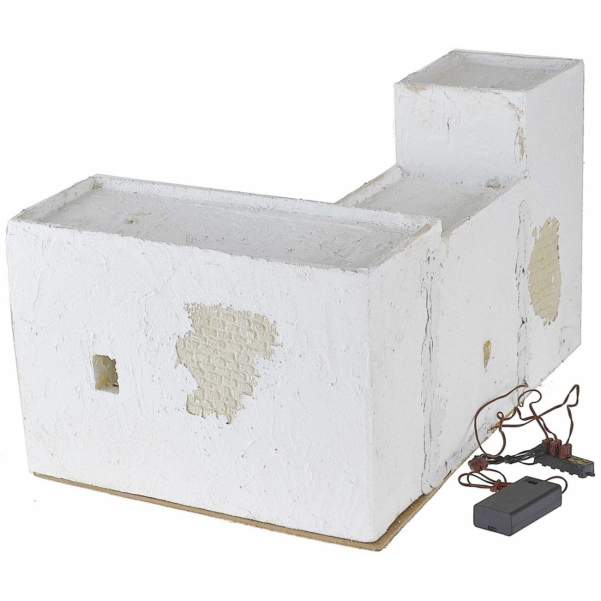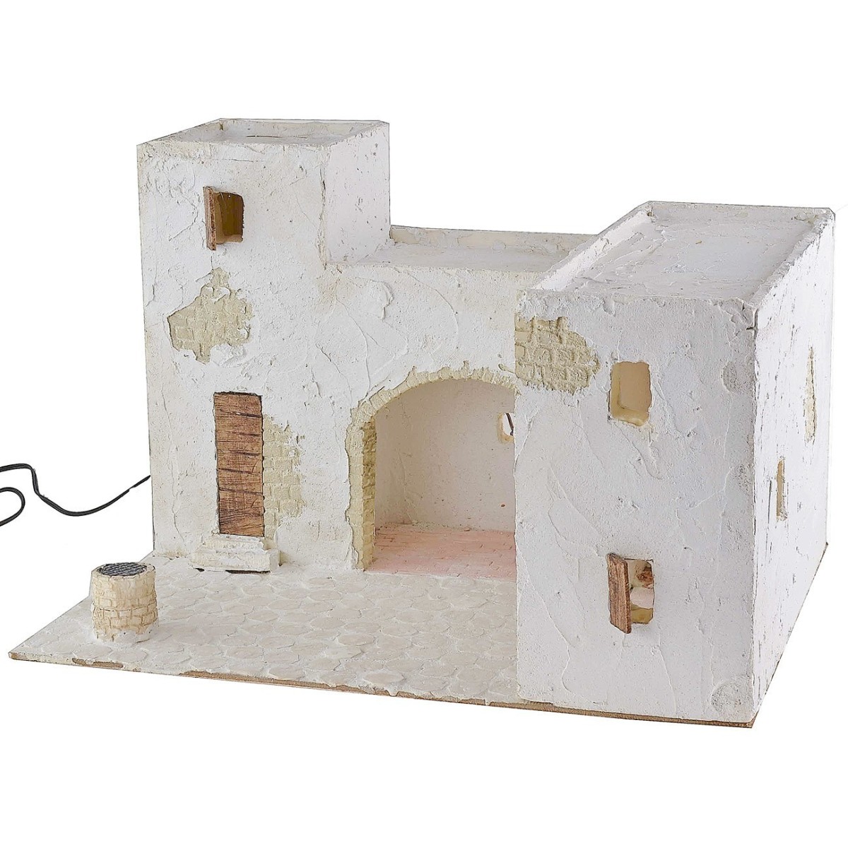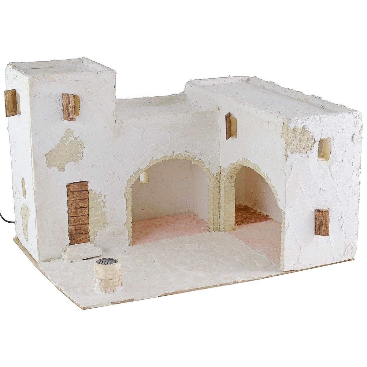 Complesso palestinese illuminato composto da due unità abitative con archi che danno su ampi portici dove poter, per esempio, riporre la Natività ed allestire botteghe o stalle. Le luci sono a bassa tensione funzionanti con il porta pile in dotazione (2xAA), nel caso in cui si preferisse a corrente sarebbe necessario l'acquisto dell'alimentatore disponibile nei prodotti correlati sotto la tabella. La particolarità di questa scenografia in stile araba sono le pareti con stucco bianco da cui si intravedono dei mattoni e nei prodotti correlati sono disponibili altri pezzi della serie per poter completare il borgo nel presepe.  Il prodotto è stato realizzato in Italia interamente a mano con polistirene, stucco e legno ed è consigliato per statuine di altezza 8 cm.
