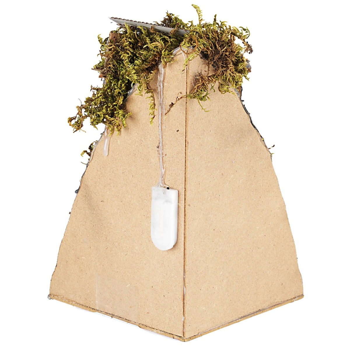 Questo edificio è illuminato da luci funzionanti a batteria ed è stato realizzato artigianalmente in Italia con legno, sughero e muschio.