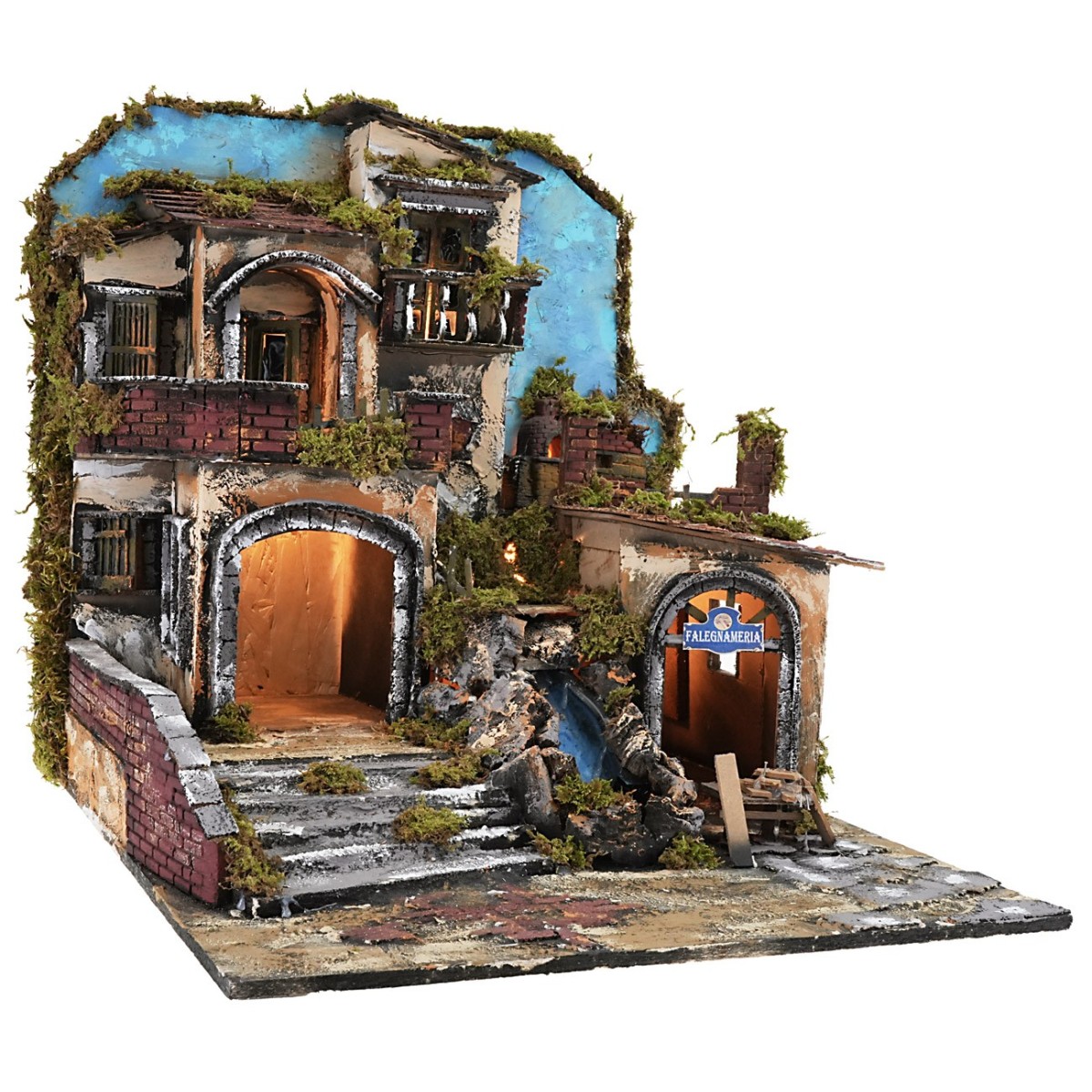 Presepe illuminato a più livelli a a cui si accede da una grande scalinata affiancata da una cascata funzionante a corrente e completa di pompa, a sinistra una bottega con insegna di falegnameria; mentre a destra un ampio locale aperto dove poter collocare, per esempio, la Natività. Al piano superiore si sviluppa un abitazione percorsa da un' ampia terrazza che, a destra, presente un forno con effetto fiamma funzionante. Il presepe è consigliato per statue di altezza 10cm ed è stato realizzato artigianalmente in Italia con legno, sughero e muschio. Si precisa che nei dettagli del prodotto sono disponibili tutte le informazioni relative alle statue da poter abbinare.