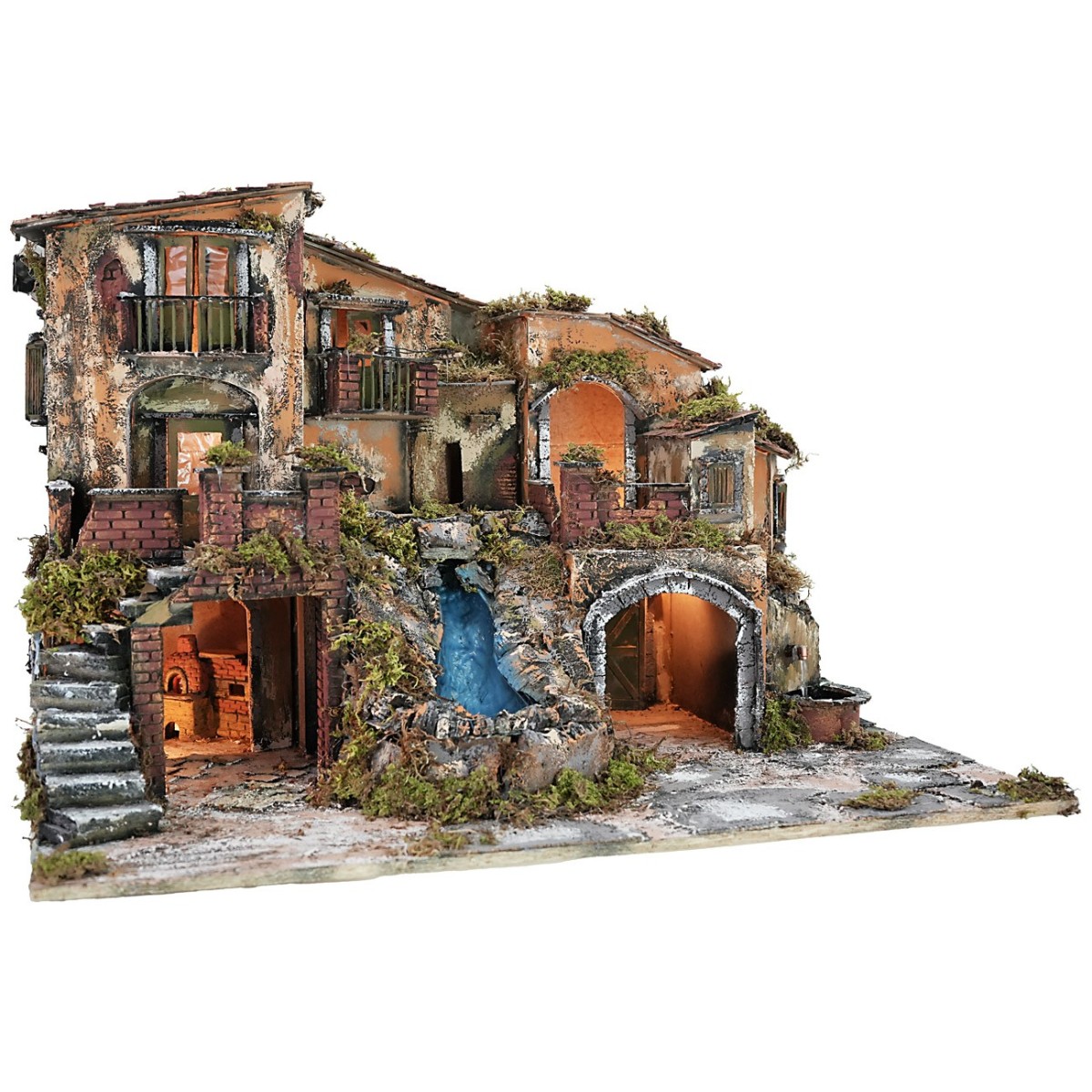 Presepe in stile napoletano illuminato al centro si trova una grande cascata affiancata da due ampi edifici aperti in cui poter collocare, per esempio, la Natività in quello ad arco e creare una pizzeria o panetteria in quello quadrato, dato che all' interno è presente un forno doppio con luce effetto fiamma. Alle due estremità sono presenti una fontana ed una scalinata che conduce alle abitazioni del piano superiore caratterizzate da ampi terrazzi. Gli infissi e i balconcini disposti a livelli diversi donano dinamismo alla struttura già ben rifinita con pareti stuccate e tanti piccoli dettagli. La cascata e la fontana sono complete di pompa, il fuoco è provvisto di luce e sono funzionanti a corrente. Il presepe è consigliato per statue di altezza 10-12cm ed è stato realizzato artigianalmente in Italia con legno, sughero e muschio. Si precisa che nei dettagli del prodotto sono disponibili tutte le informazioni relative alle statue da poter abbinare.