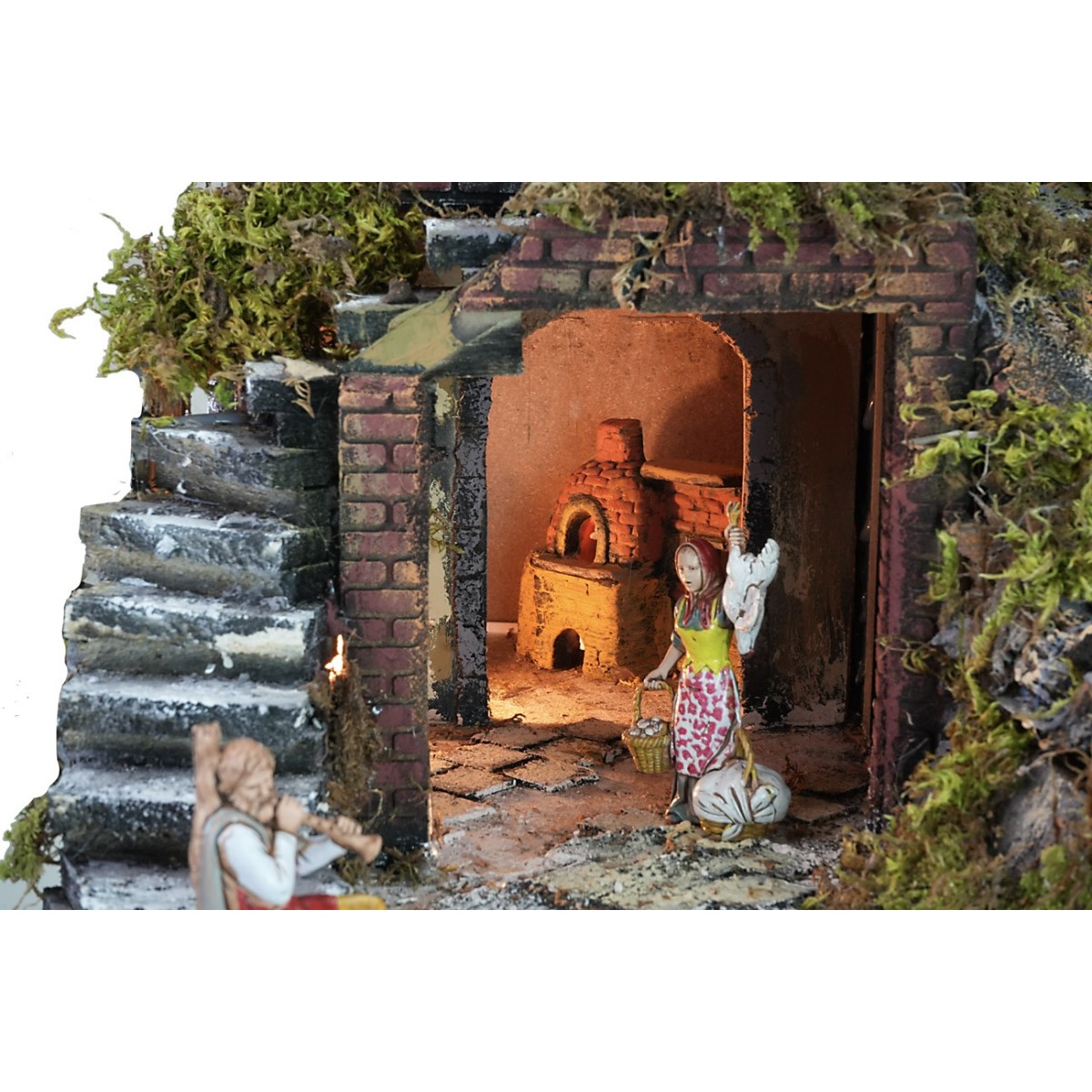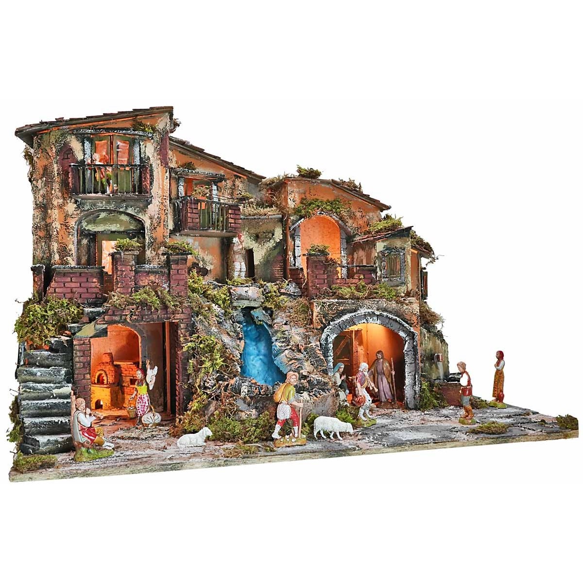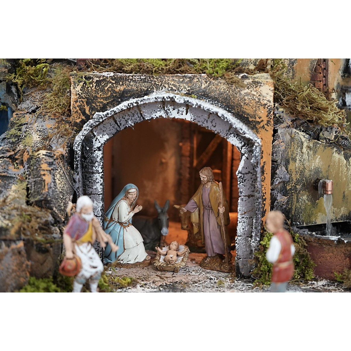 Presepe illuminato al centro si trova una grande cascata affiancata da due ampi edifici aperti: in quello ad arco è posizionata la Natività, mentre in quello quadrato è presente un forno doppio con luce effetto fiamma. Alle due estremità sono presenti una fontana ed una scalinata che conduce alle abitazioni del piano superiore caratterizzate da ampi terrazzi. Gli infissi e i balconcini disposti a livelli diversi donano dinamismo alla struttura già ben rifinita con pareti stuccate e tanti piccoli dettagli. La cascata e la fontana sono complete di pompa, il fuoco è provvisto di luce e sono funzionanti a corrente. Il presepe è completo di statue serie cm 10 Landi Moranduzzo ed è stato realizzato artigianalmente in Italia con legno, sughero e muschio. Si precisa che queste statue hanno un'altezza leggermente inferiore rispetto al nome della serie, inoltre l'articolo verrà consegnato con la medesima quantità di personaggi presenti nelle immagini ma le figure potrebbe variare in base alle disponibilità del momento.